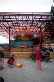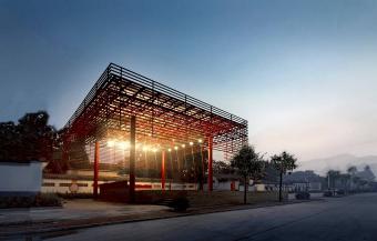 紅色是中國(guó)鄉(xiāng)村喜愛的色彩,整個(gè)屋面結(jié)構(gòu)被喜慶的紅色噴涂,猶如一個(gè)紅燈籠,成為村子的標(biāo)志性構(gòu)筑。戲臺(tái)所在的廣場(chǎng)同時(shí)還是一個(gè)鄉(xiāng)村集市的場(chǎng)地,每當(dāng)集市的時(shí)候五顏六色的貨攤和熙熙攘攘的人群與這座巨大的紅傘蓋形成一幅奇幻而又互相映襯的鄉(xiāng)村生活景象,同時(shí)傘蓋和下放多功能的基座空間還可以容納一部分集市攤位,使戲臺(tái)與鄉(xiāng)村集市融為一體。