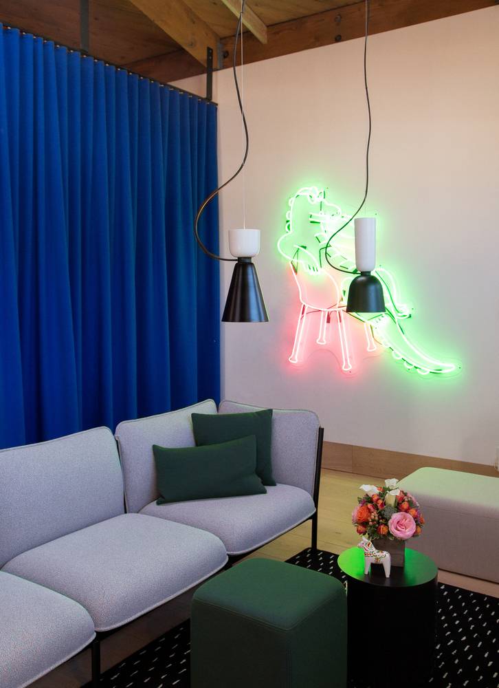 超大的五彩噴繪圖案從墻壁一直延伸到地面,暗示著圍繞著庭院的辦公空間構(gòu)成一個(gè)整體,推動(dòng)著各種商業(yè)社交活動(dòng)順利進(jìn)行?;盍M滿的庭院空間鼓勵(lì)各種充滿創(chuàng)意的融合,并能夠以新的姿態(tài)適應(yīng)未來(lái)的各種展示需求。庭院被打造為沉浸式體驗(yàn)空間,色彩繽紛的環(huán)境讓人心情愉悅。五彩庭院( Confetti Courty )為該品牌正在進(jìn)行的項(xiàng)目營(yíng)造出極為理想的展示氛圍:獨(dú)特的動(dòng)態(tài)裝飾方式為展覽提供了創(chuàng)意十足的背景。
