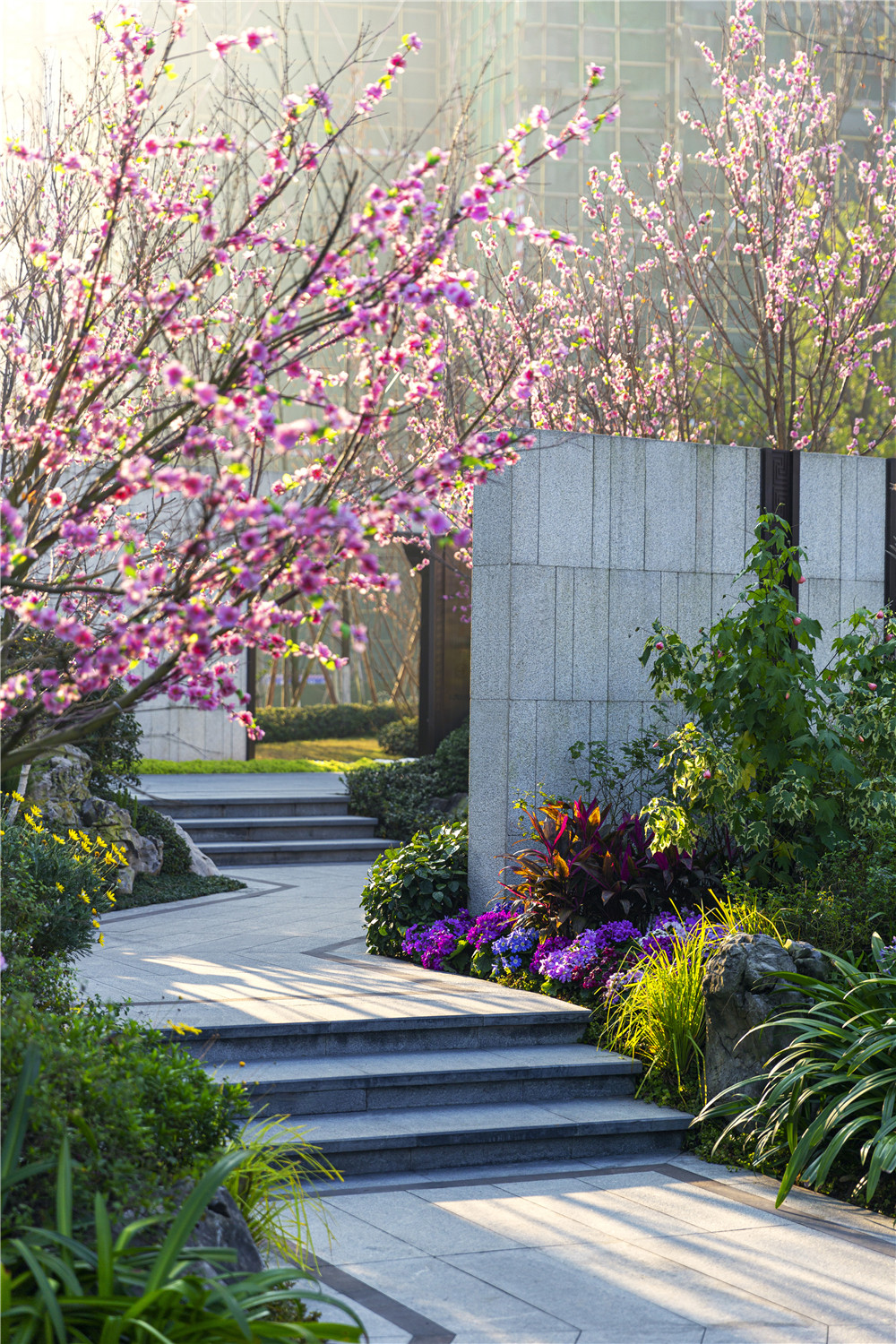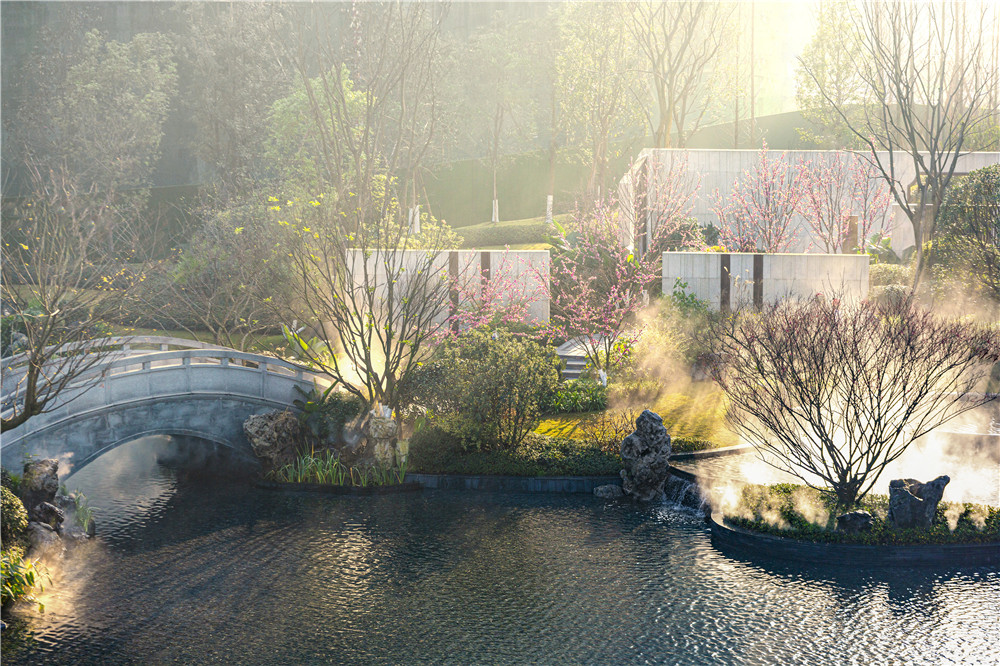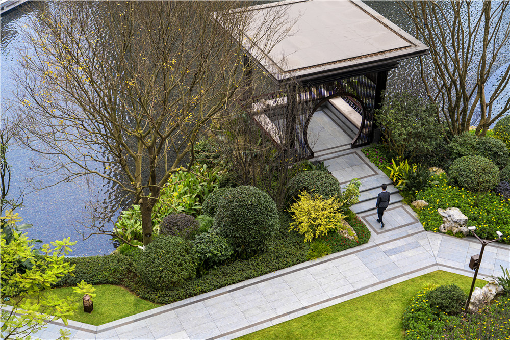 依托濱江河岸的天然地勢,整個建筑高低錯落,層層退臺排布,形成豐富的城市天際線。景觀設(shè)計秉承“東韻西境”匠筑理念,采擷中西園林精髓。令這里外享“一河、三公園、三濕地”自然生態(tài)資源;內(nèi)設(shè) “一軸兩府”、“三臺六庭十景”人居園林體驗。