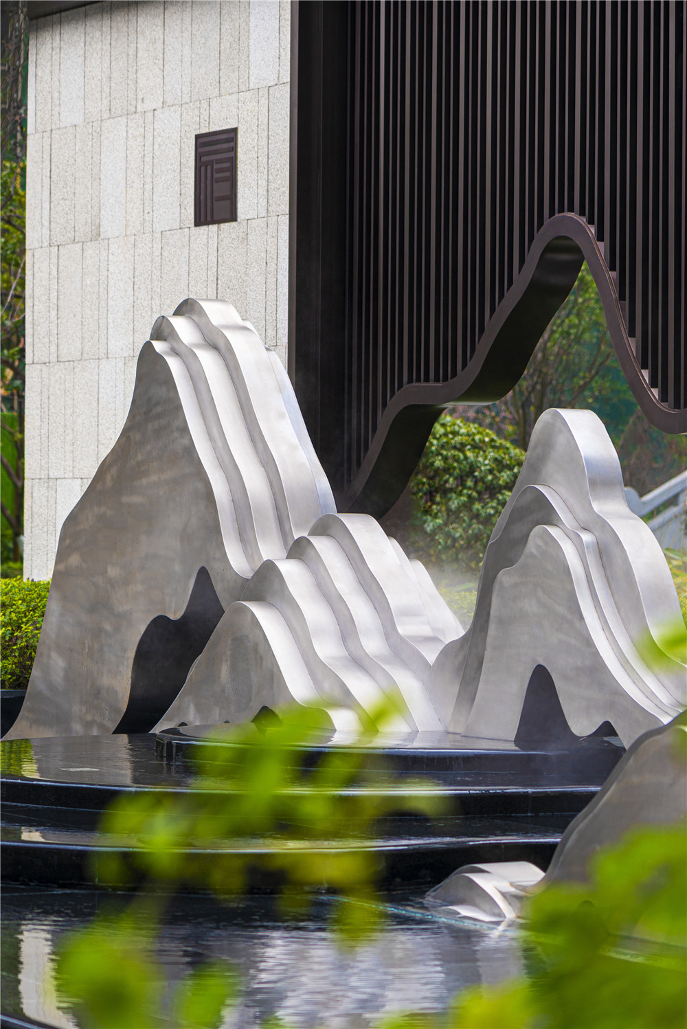 入口大門承襲“高山流水”之意境,以山水景墻、對稱水景強調(diào)建筑空間的禮序感與縱深感,蜿蜒的曲線,靜幽的連廊,行走在游園驚夢的詩意居所,盡顯山水雅韻,體驗心靈回歸。