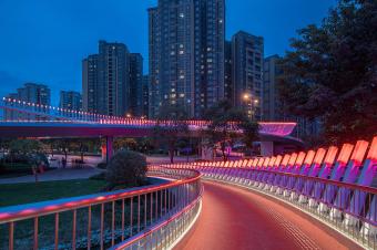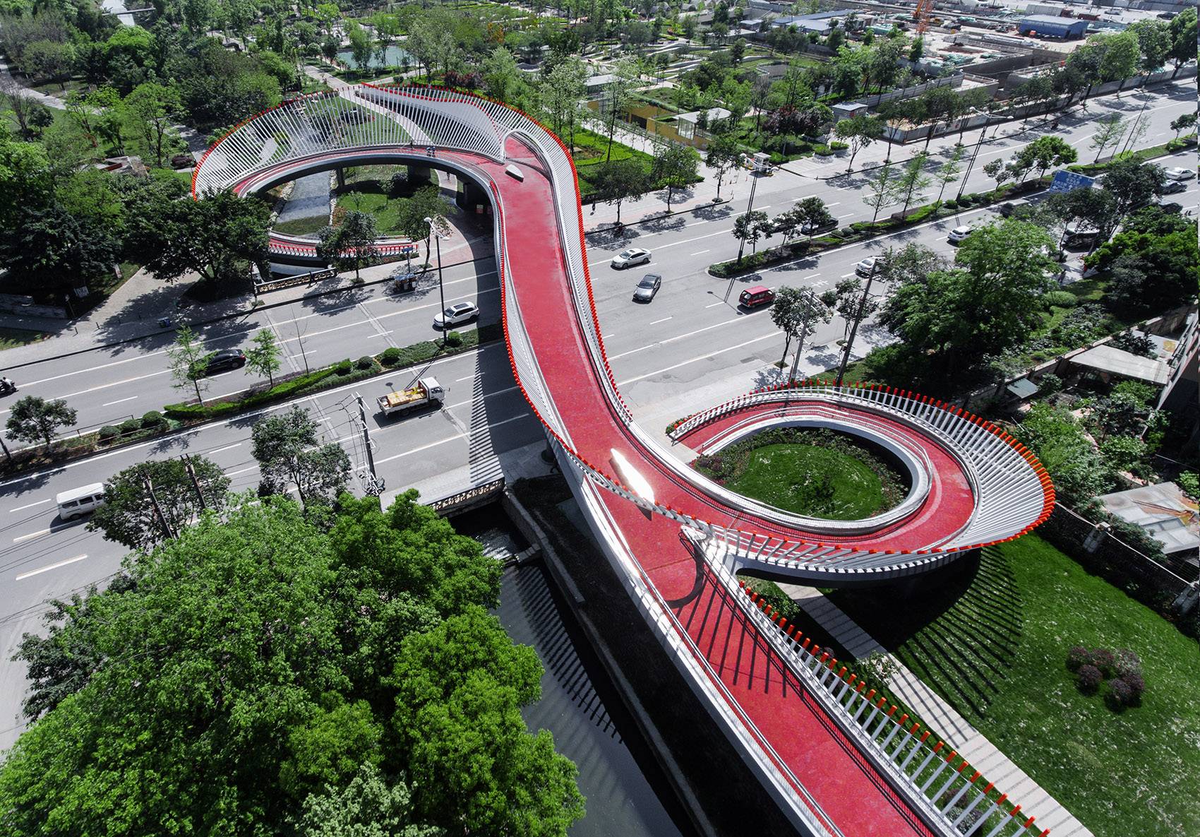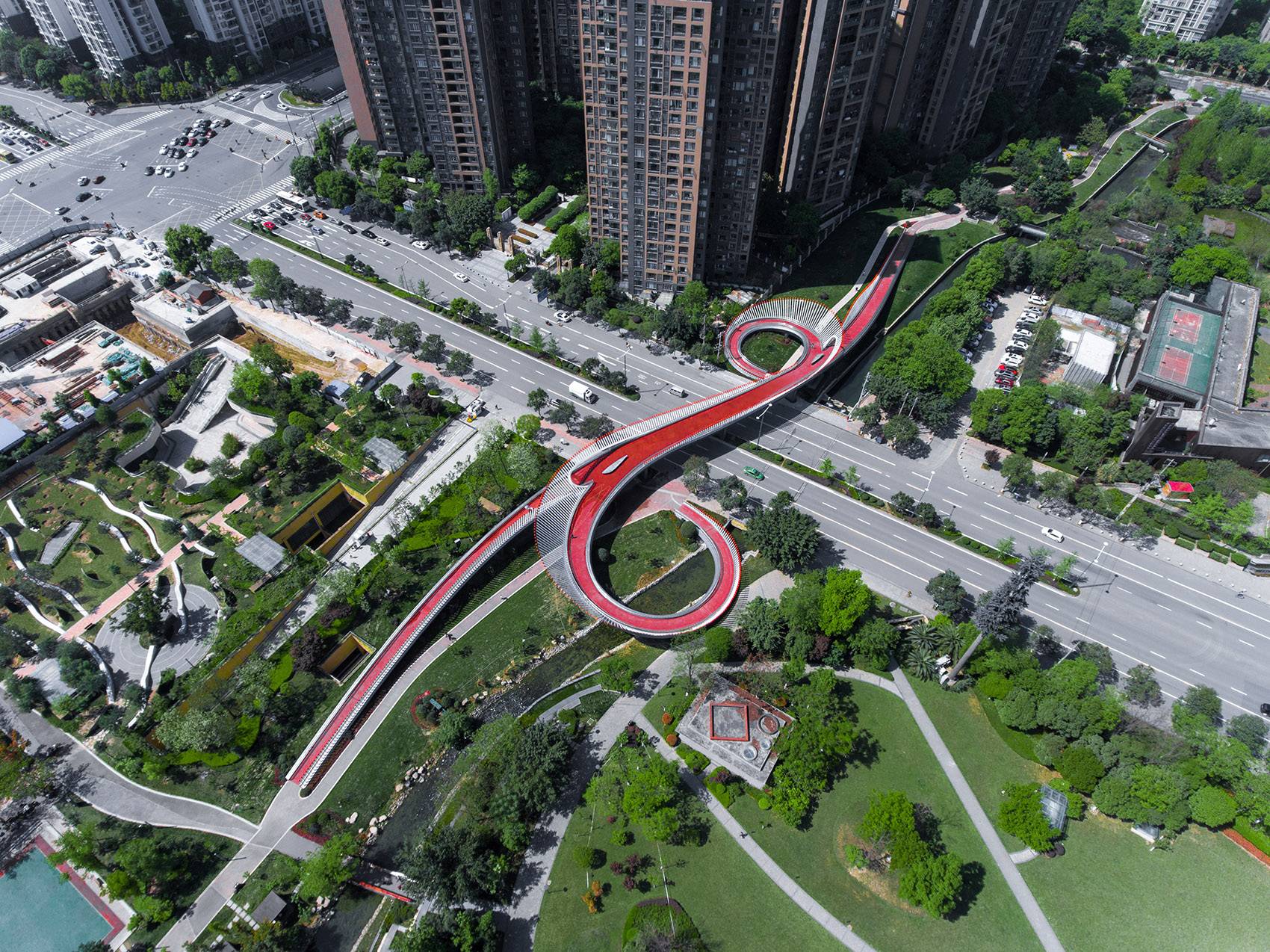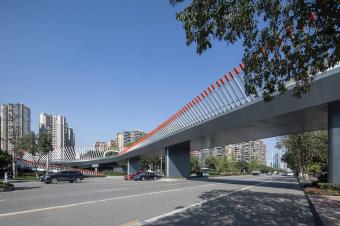 Ruyi Bridge is located at Tianfu 2nd Street near the Jian’nan Road intersection in the High-tech Zone of Chengdu, south of CR Phoenix City. The bridge crosses Tianfu 2nd Street, and the main bridge is facing the greenway of Dayuan Central Park.