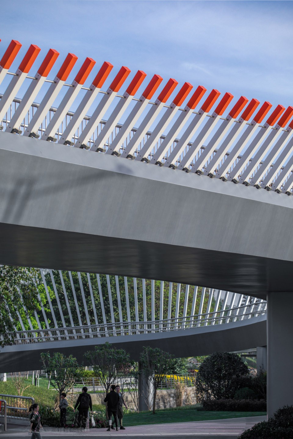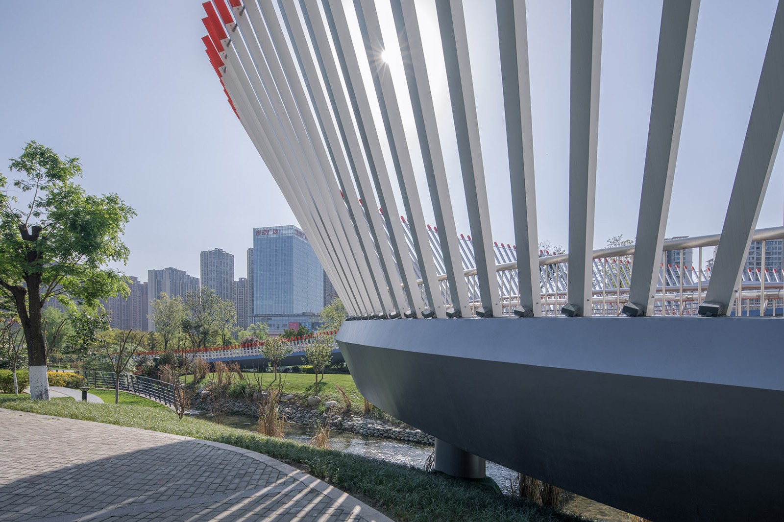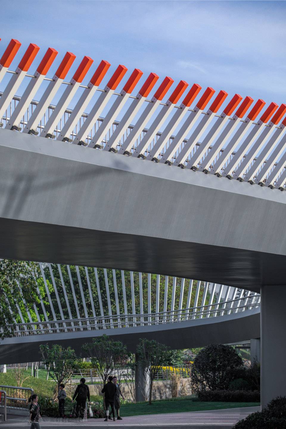 The design concept is called Sound of Panpipes, as the facade design is inspired by the Chinese Panpipes witch is one of the traditional Chinese musical instrument. The undulations and fluttering of the body are like the flow of music rhythm, fresh and elegant. It shaping a functional urban sculpture. Viewed from the air, the bridge seems just like a Ruyi embedded in the city. Ruyi, a Chinese traditional S-shaped ornamental object, usually made of jade, formerly a symbol of good luck. Bridge like this shape with the meaning that all things are going smoothly and good luck.