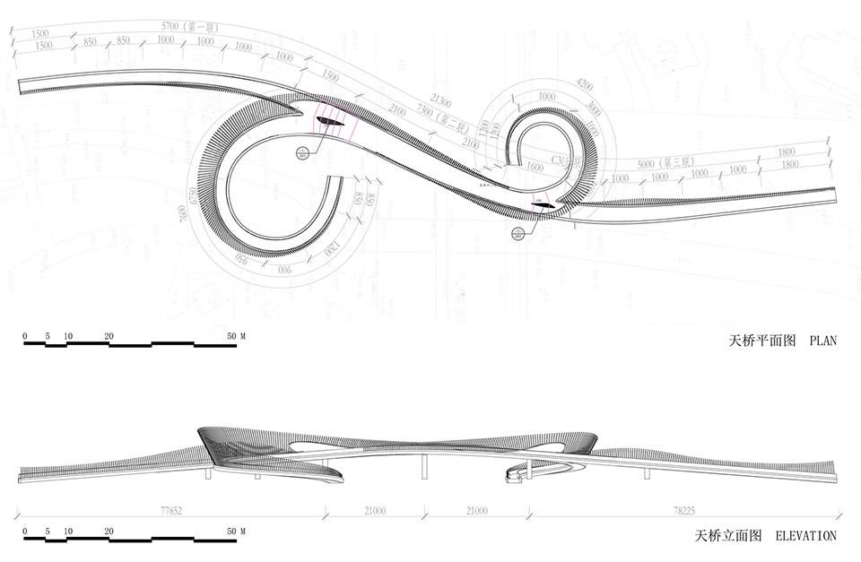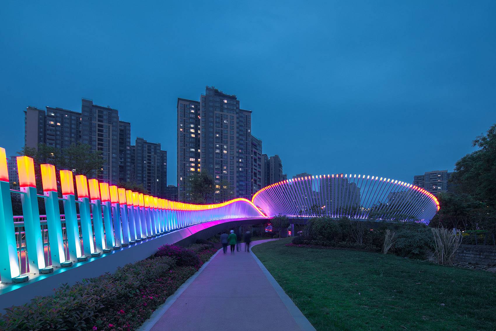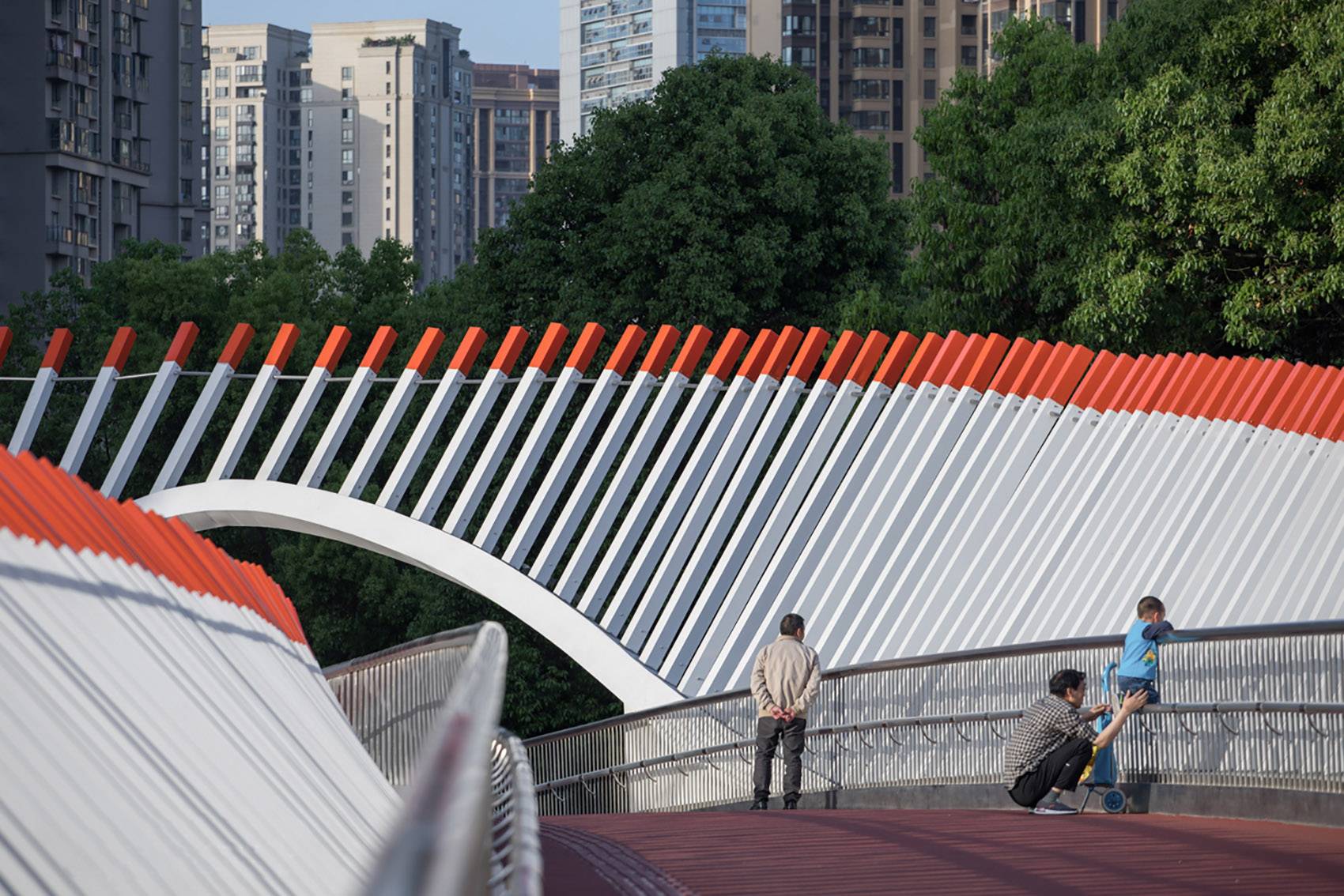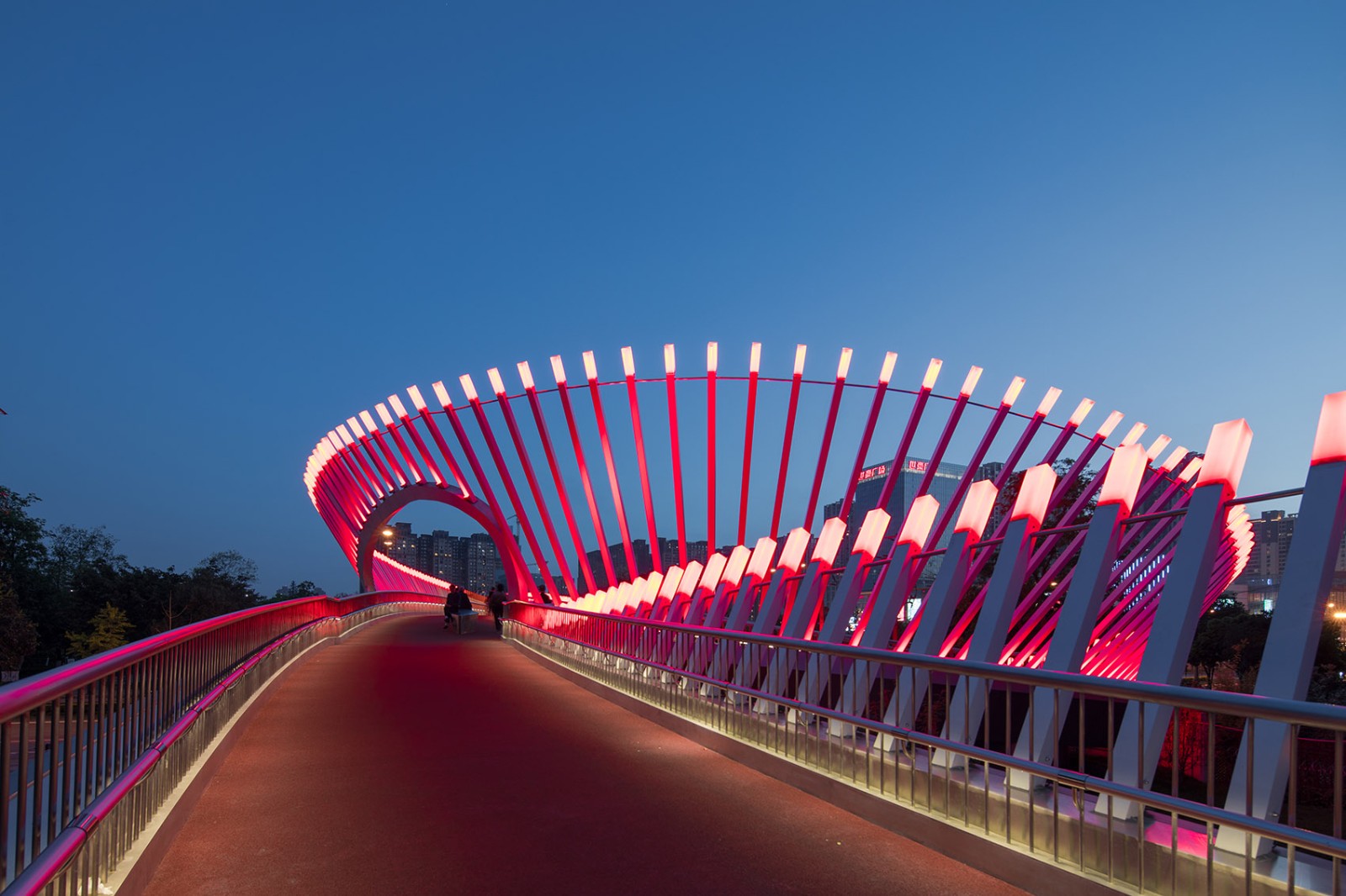 The design concept is called Sound of Panpipes, as the facade design is inspired by the Chinese Panpipes witch is one of the traditional Chinese musical instrument. The undulations and fluttering of the body are like the flow of music rhythm, fresh and elegant. It shaping a functional urban sculpture. Viewed from the air, the bridge seems just like a Ruyi embedded in the city. Ruyi, a Chinese traditional S-shaped ornamental object, usually made of jade, formerly a symbol of good luck. Bridge like this shape with the meaning that all things are going smoothly and good luck.