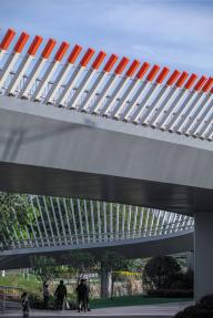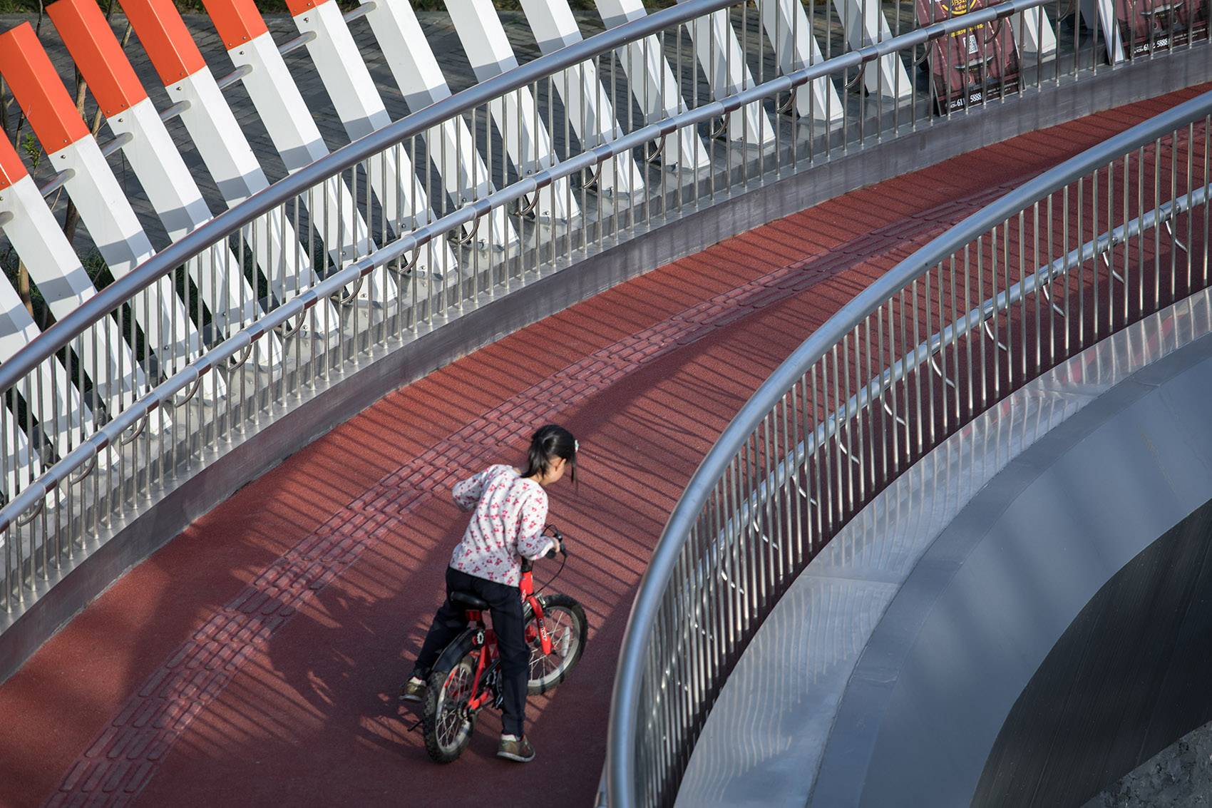 There are 2 spans of the main bridge crosse Tianfu 2nd Street. To facilitate the pedestrian crossing, both sidewalks disposed spiral stairways with inclination 1:4 to 1:12. On the other hand, in order to connect the greenways on both sides of the street, 2 bicycle ramps are installed with inclination 1:12 at the ends of the main bridge. The bridge connects Dayuan Park on the south to the urban space and green landscape on the north side. The pedestrian and bicycle lanes are connected and continued.
