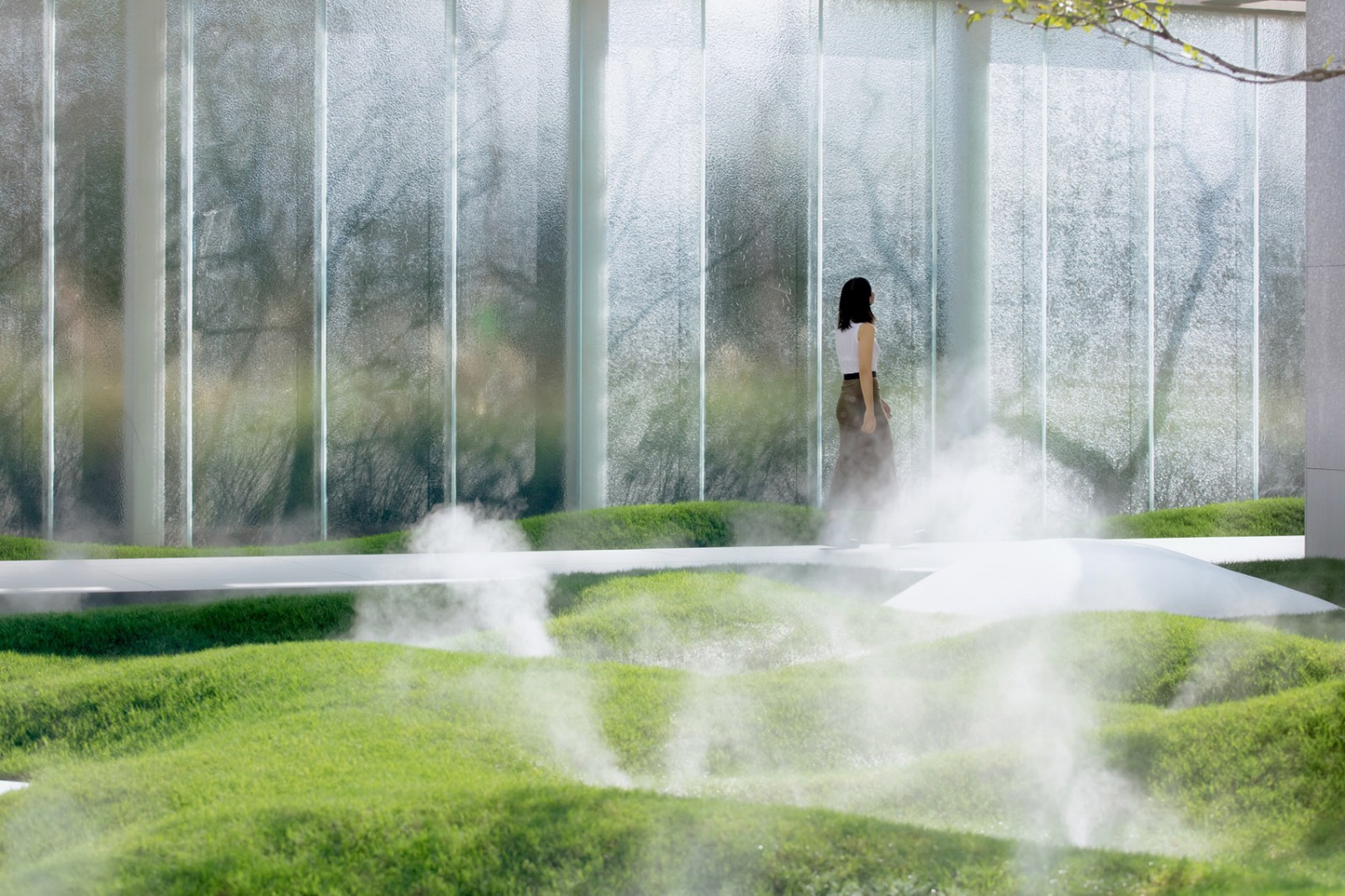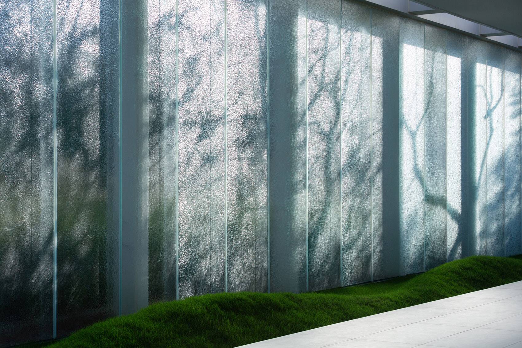 玻璃的選擇尤為重要,高度與厚度成為項目的難點,最終我們選擇了采用4900*900的藝術(shù)紋理熱熔玻璃,讓整個圍合的場地空間變得通透起來,在光影之下的投射形成的幻化的藝術(shù)之美。