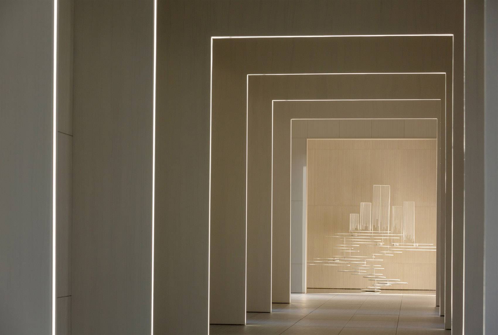 同時,考慮藝術(shù)的視覺感知,漂浮的大門橫向延伸,將大門構(gòu)筑漂浮離地面至一米的距離,構(gòu)筑后半部分為結(jié)構(gòu)主要受力部分讓整個大門向外懸挑2700mm,構(gòu)筑下方以柔軟的地形做依托結(jié)合結(jié)構(gòu)墻以鏡面不銹鋼貼面形成反射,讓底部形成消隱懸空,大門構(gòu)筑以1450*2700mm超白玻及極細(xì)的扁鋼線條方式創(chuàng)造極簡的整體形象,更輕盈的呈現(xiàn)出漂浮的設(shè)計感。