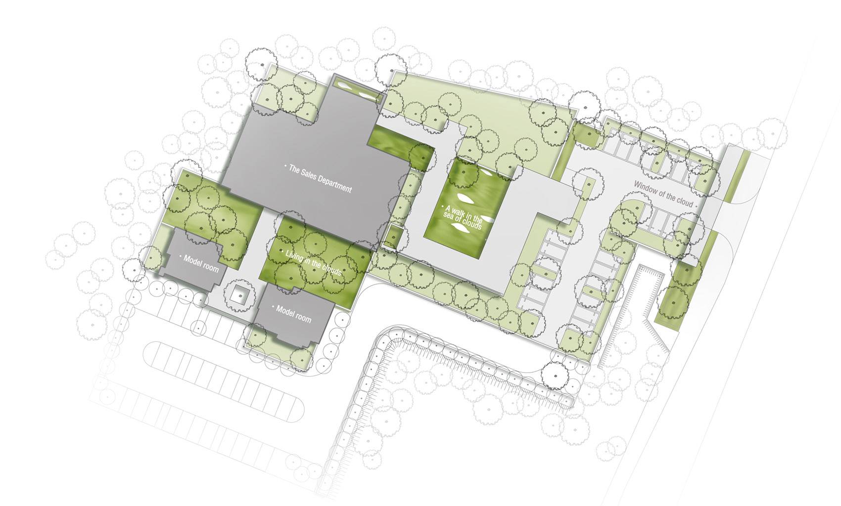 Cloud is tender and free. The terrain of core area is inspired by the sea of clouds. The site skillfully expands the space, mutually infiltrates the environment, and expresses the artistic perception of the space. In this way, the boundary between space can be eliminated and interspersed freely. “Restore a scenery derived from nature, but scenery had never appeared in the nature before. ” becomes the conceptual basis of terrain shaping.