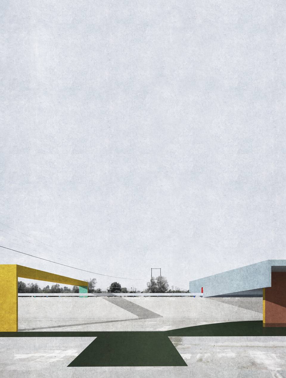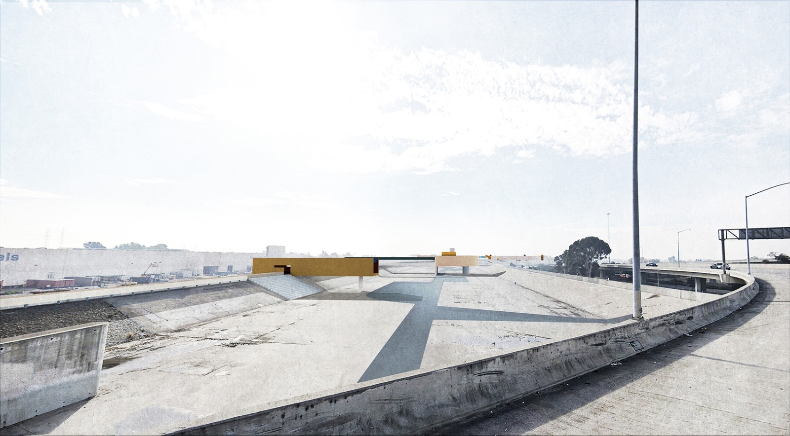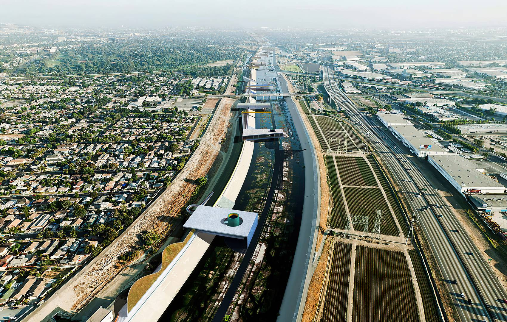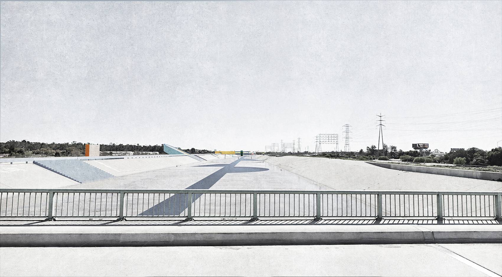 The new structures and new walkways are subtly colored to intensify and reflect the quality of the Los Angeles light against the sky. This strategy was derived from the Ocean Park paintings of Richard Diebenkorn, in which the artist painted the colors of the air within an abstract grid of streets and built elements. The new structures placed within the river become built manifestations of these paintings— three-dimensional compositions of form, color, and light, perceptible for the driver and the pedestrian, bridging the scale of the city, infrastructure, and the individual.