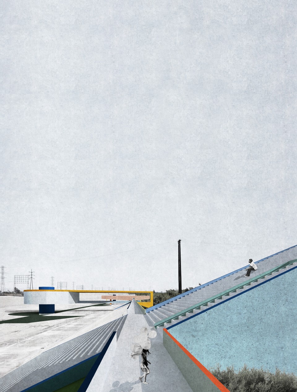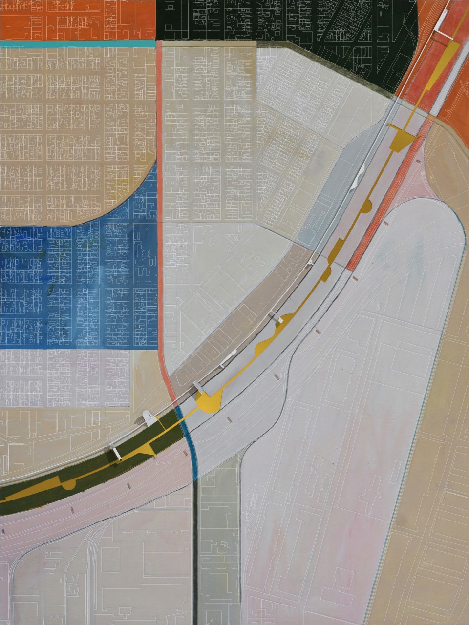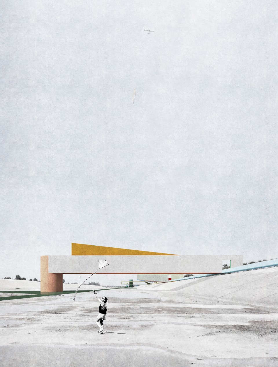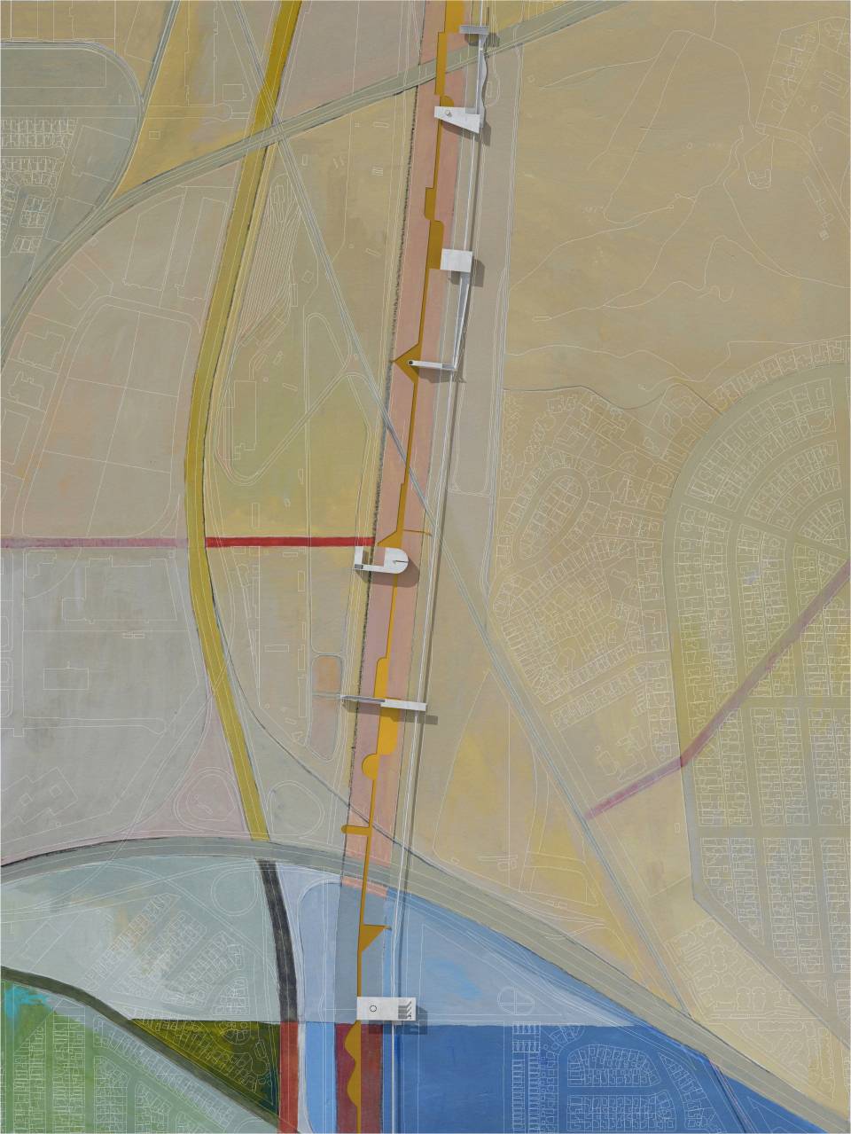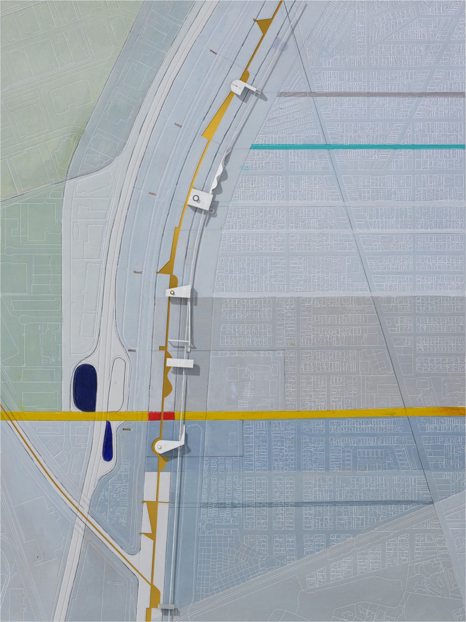 The new structures and new walkways are subtly colored to intensify and reflect the quality of the Los Angeles light against the sky. This strategy was derived from the Ocean Park paintings of Richard Diebenkorn, in which the artist painted the colors of the air within an abstract grid of streets and built elements. The new structures placed within the river become built manifestations of these paintings— three-dimensional compositions of form, color, and light, perceptible for the driver and the pedestrian, bridging the scale of the city, infrastructure, and the individual.