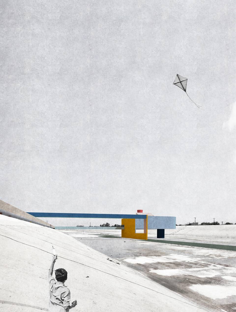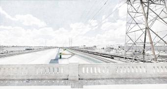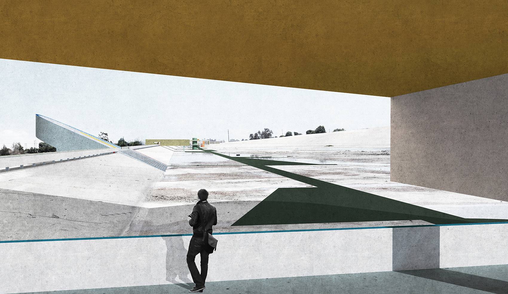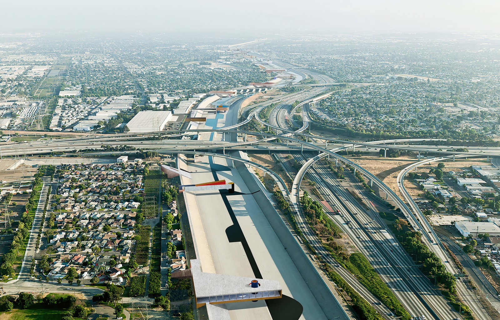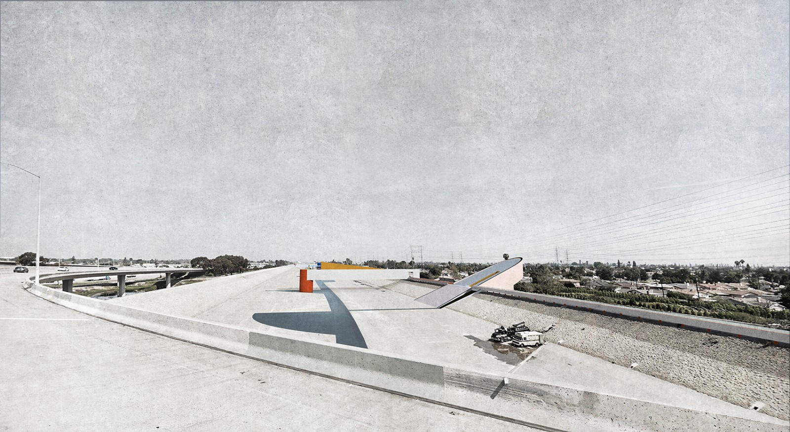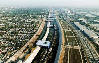 洛杉磯河空間形態(tài)獨(dú)特,具有巨大的城市和建筑潛力。雖然它原本只是一條細(xì)流,但是現(xiàn)在供應(yīng)著貫穿城市的工業(yè)和基礎(chǔ)管道設(shè)施,從洛杉磯市中心延伸至長灘。1939年,為了預(yù)防洪災(zāi),工兵部隊(duì)對河流進(jìn)行疏導(dǎo),使得周邊住宅區(qū)穩(wěn)定發(fā)展。這條河并非完全自然或人造,它十分宏偉且被城市限定,與附近社區(qū)緊密相連,卻又排除在城市體驗(yàn)之外。