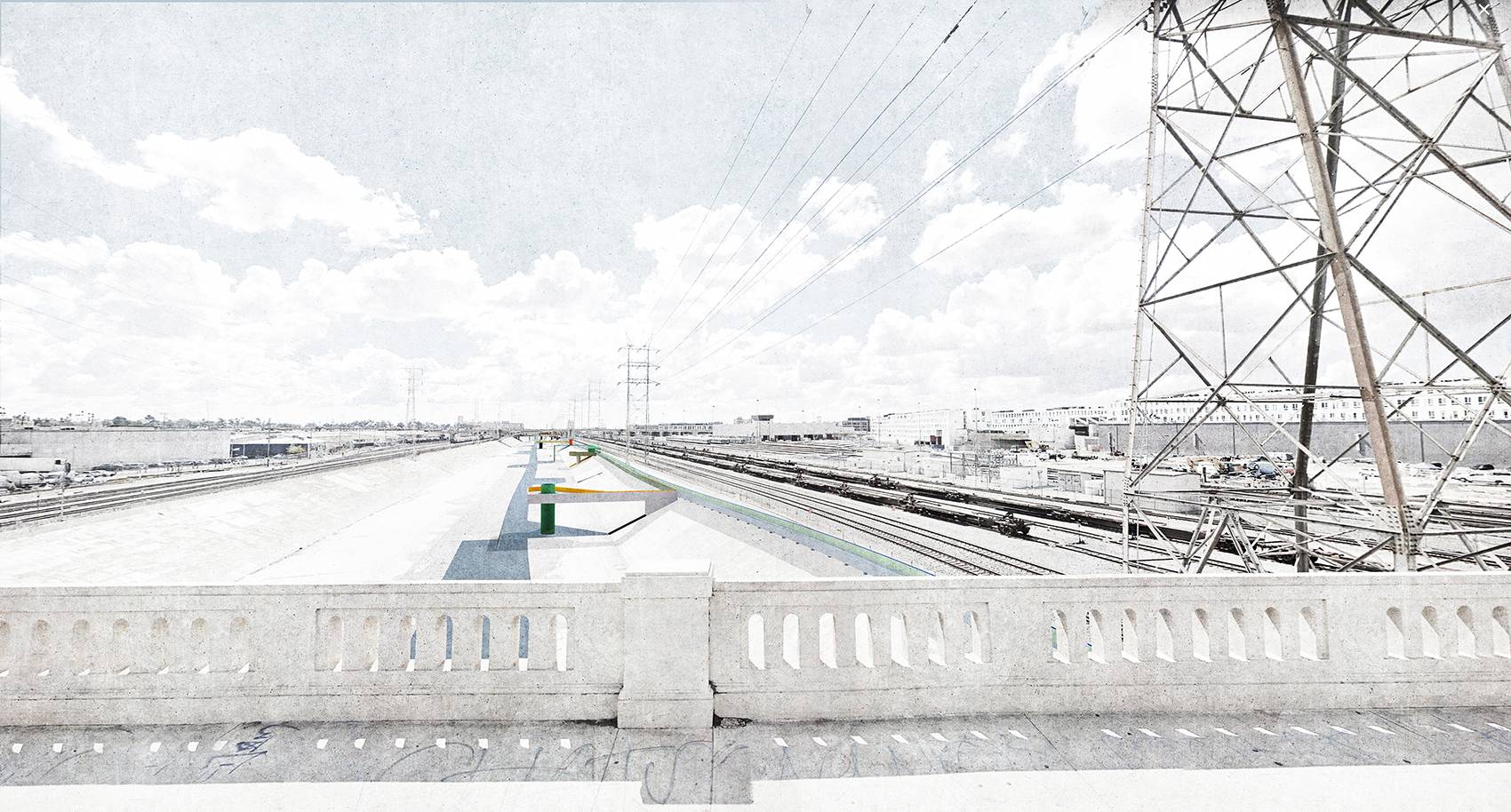 Recent efforts to reimagine the river have revolved around the idea of creating a “green zone” or linear park space within the channel, and treating the river essentially as a new “High Line”. This proposal suggests an alternate solution, one that considers the river as entirely indigenous to Los Angeles and seeks to harmonize it as it is with the surrounding city fabric in a site-specific way. Most importantly, the proposal does not seek to create an artificially “natural” environment within the channel nor to create a tourist destination or development opportunity.