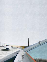 從車行和鳥瞰視角看,整個(gè)河道仿佛一組線性雕塑,從人的視角看,它是連接城市社區(qū)的線性公共場所,為人們創(chuàng)造出新的活動(dòng)空間。該河道是沐浴陽光的通道,也是悶熱環(huán)境中的風(fēng)道。人們從日常生活轉(zhuǎn)換到極其平靜和宏偉的場所,身處并非完全自然的人工河道中,光、風(fēng)、天空和水變得更加生動(dòng)。為了使河邊空間更宜居,這種非自然的品質(zhì)得以保留。