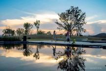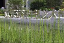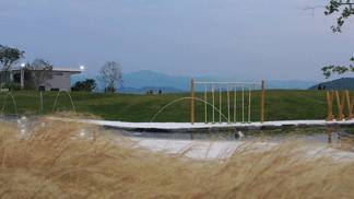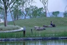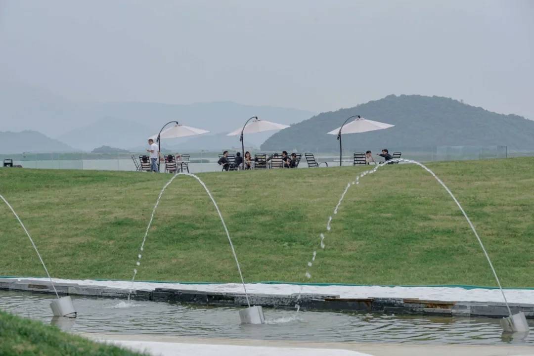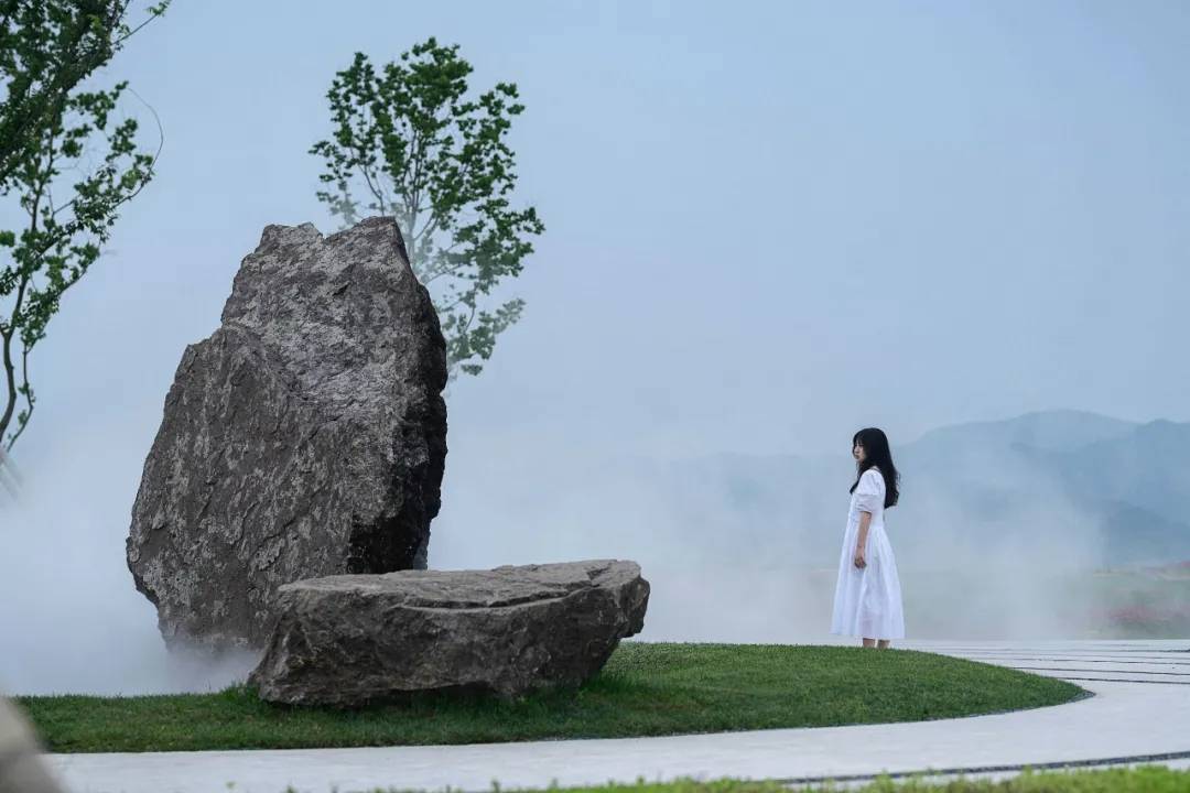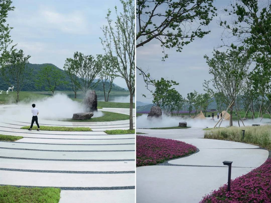 原生的芒草營(yíng)造質(zhì)樸的氛圍,直立的木賊在平靜的水面中耐人尋味。遠(yuǎn)處的草坡上散落著紫石,似乎在等待著人們參與其中。