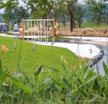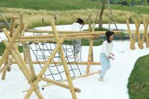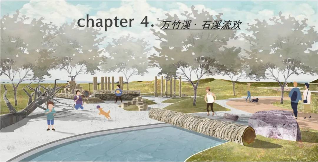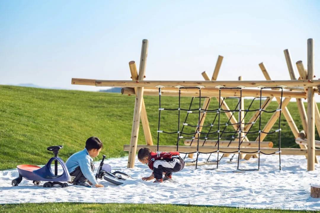 起伏的草坡與高大的喬木圍合下,錯(cuò)落的木樁,具有天然的親和力,流水潺潺,風(fēng)聲和水聲和鳴,充滿好奇心的孩童探索于溪澗白沙之間。