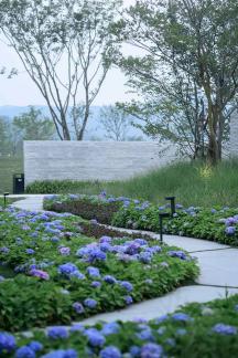 抽象的邊界(輕干預(yù)): 場(chǎng)地內(nèi)外植物穿插,不做常規(guī)圍擋。借景于附近的山海、植物,綿延的山脈、清澈的海灣,在視覺上延伸了場(chǎng)地空間,人為之景和自然之景融為一體。