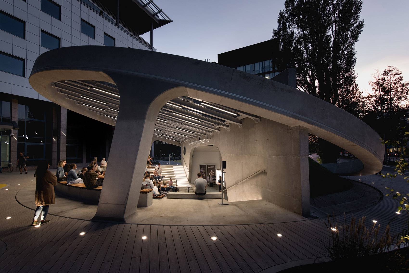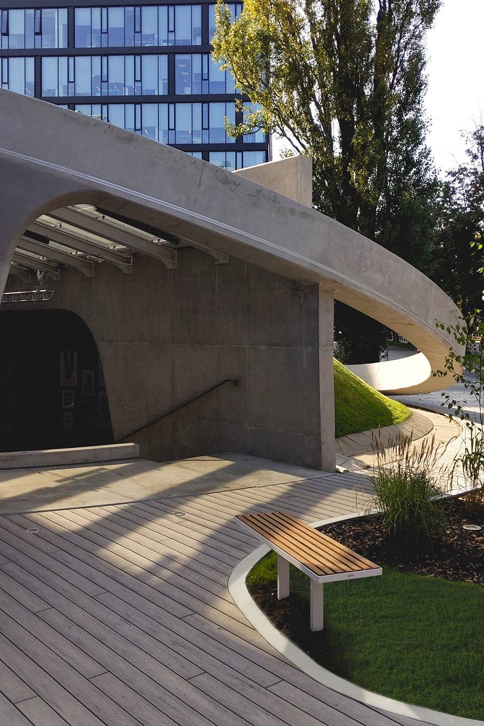 Amphitheatre is the open, democratic space dedicated to holding interesting meet-ups and performance arts, that would be easily accessible for each and every tenant and employees of the S?u?ewo’s business sector. Outdoor scene rose to face the demand that haunts Warsaw’s business district – lack of open and public spaces, free of fences, allowing for casual, friendly meetings out in the open.