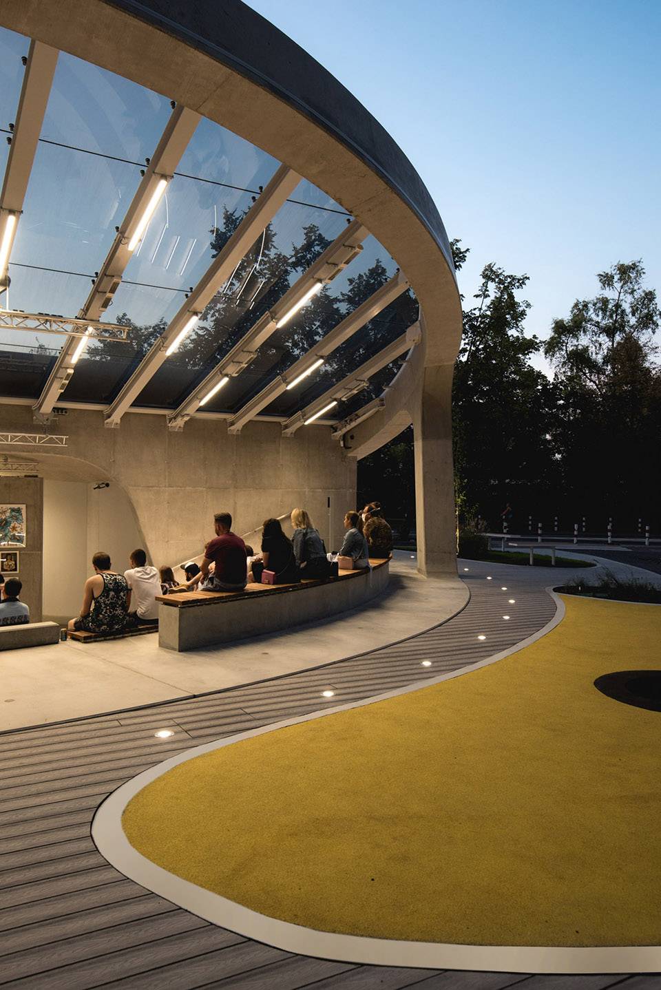 ▲巨大的混凝土環(huán)將玻璃屋頂與街道旁的草地山丘環(huán)繞在中間 ?Patryk Lewiński