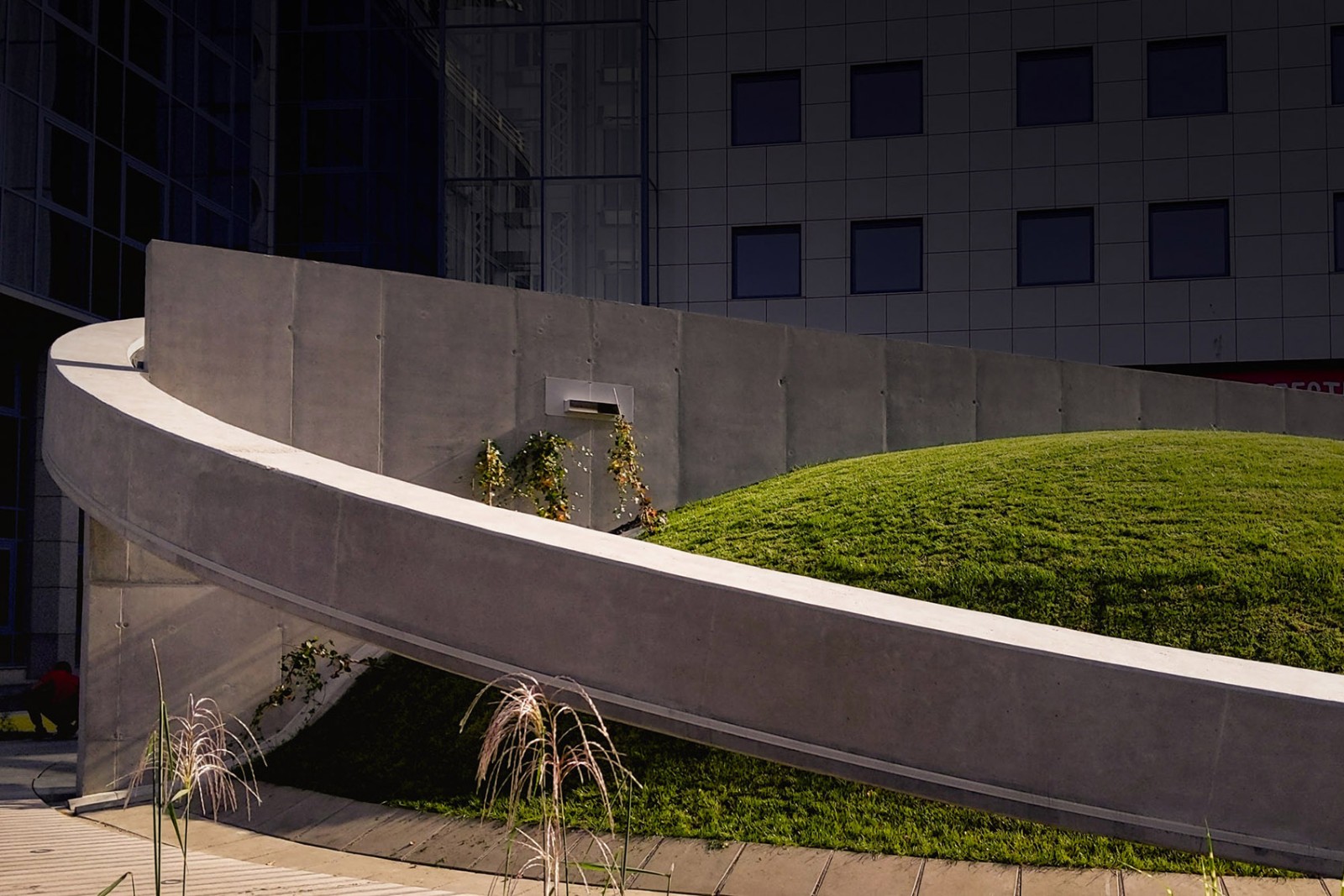 monumental concrete ring encircling both concrete/englassed roof as well as grass-covered hill by the street