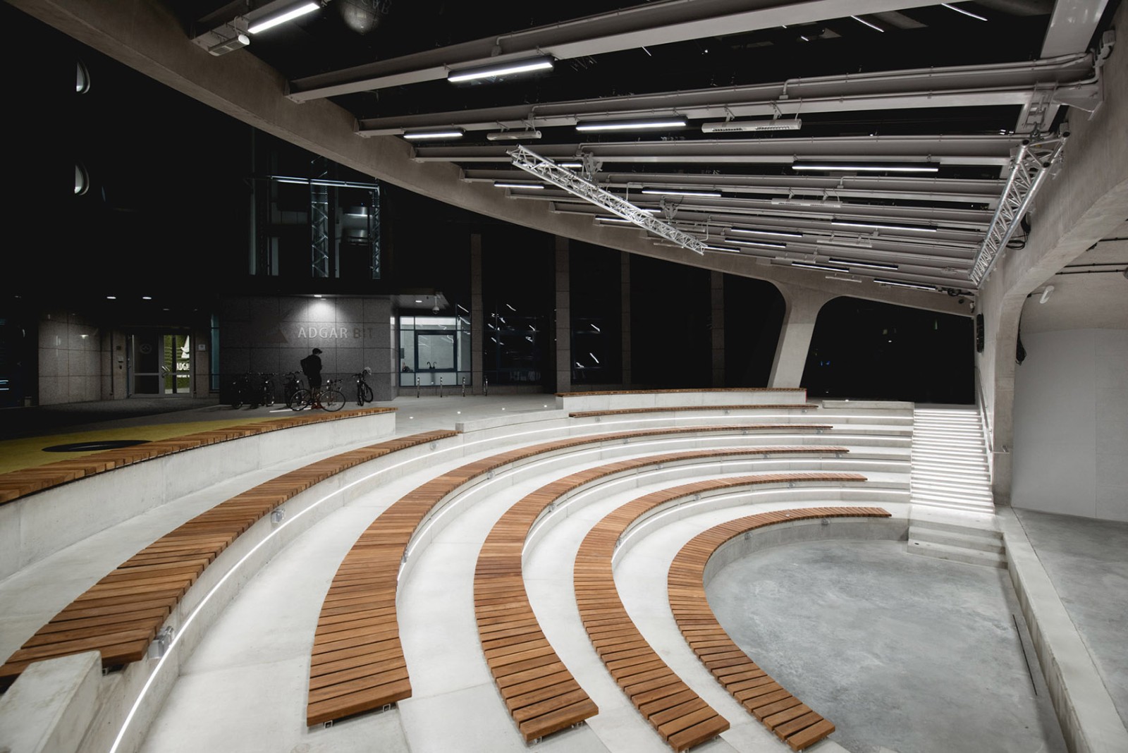 露天劇場內(nèi)設(shè)有40平方米的主舞臺、主舞臺窗口(11米長,4米寬)、能夠容納約140名觀眾的座位席、大面積覆蓋的WIFI、殘疾人士專用座位以及各區(qū)域的獨(dú)立照明。根據(jù)投資方的意愿,舞臺配備了最新的音視頻線路,能夠同時(shí)從建筑設(shè)備管理系統(tǒng)和導(dǎo)演室層級上操控。