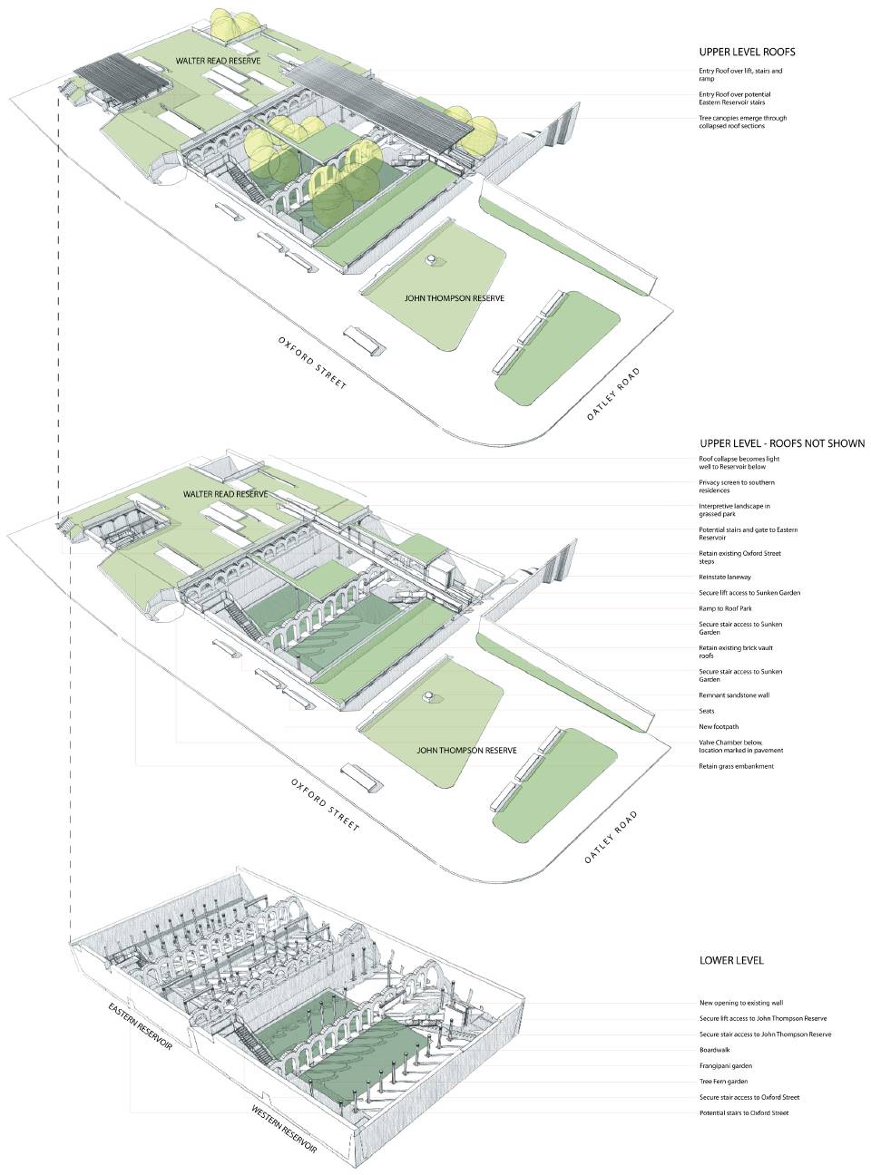 When TZG and JMD were commissioned to convert the Paddington Reservoir into an urban park, the general expectation was that the site would be capped off and a brand new arrangement built on top. However, we were captivated by the possibilities of revealing the 19th century structures as a ruin through which members of the public could wander, taking in the dramatic spaces and play of light across the remnants of historic walls and vaults.?Listed as a site of state heritage significance, the Paddington Reservoir was originally constructed in two stages, completed in 1866 and 1878. The operational life of the reservoir ceased in 1899 and the site was used as a workshop and garage until 1990 when roof collapses forced its closure. The water chambers were built below street level with a grassed park above, opened to the public in the 1930’s.