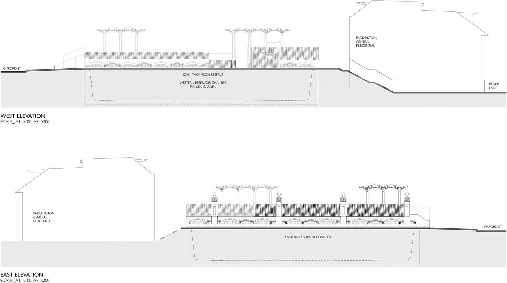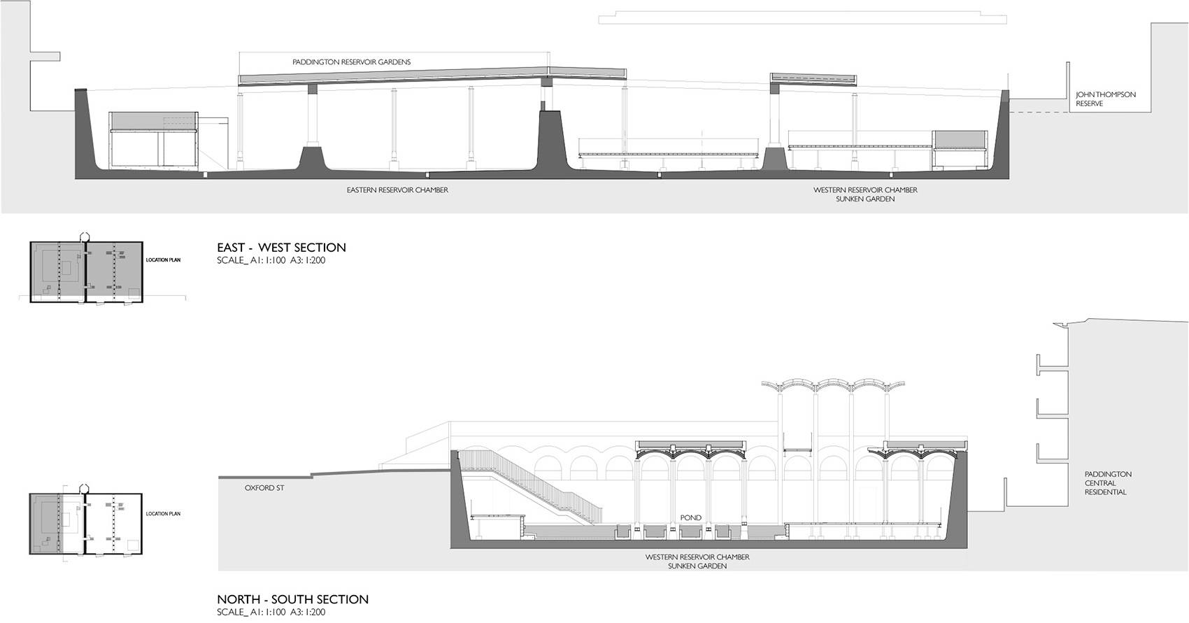 TZG和JMD受委托將帕丁頓蓄水池改造成城市公園,公眾普遍希望將場(chǎng)地封頂,并在頂部新建景觀。然而建筑師著迷于暴露19世紀(jì)的殘骸,使人們可以漫步其中,穿過墻壁和拱券遺跡,感受光影綽綽和戲劇化的空間。帕丁頓蓄水池是重要的國(guó)家遺產(chǎn),曾經(jīng)分兩個(gè)階段建造,分別于1866年和1878年竣工。蓄水池于1899年停用,后用作車間和車庫(kù),直到1990年其屋頂坍塌,被迫關(guān)閉。儲(chǔ)水室位于街道平面之下,上方是草地公園,于1990年對(duì)公眾開放。