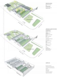 Two lightweight roofs float above the reservoir, signalling the main entry points to the park. The lightness of the roofs act as a counterpoint to the solid earthiness of the masonry vaults, while there is a whimsical reference to the older masonry mortar joints in the staggered pattern of the metal grid.