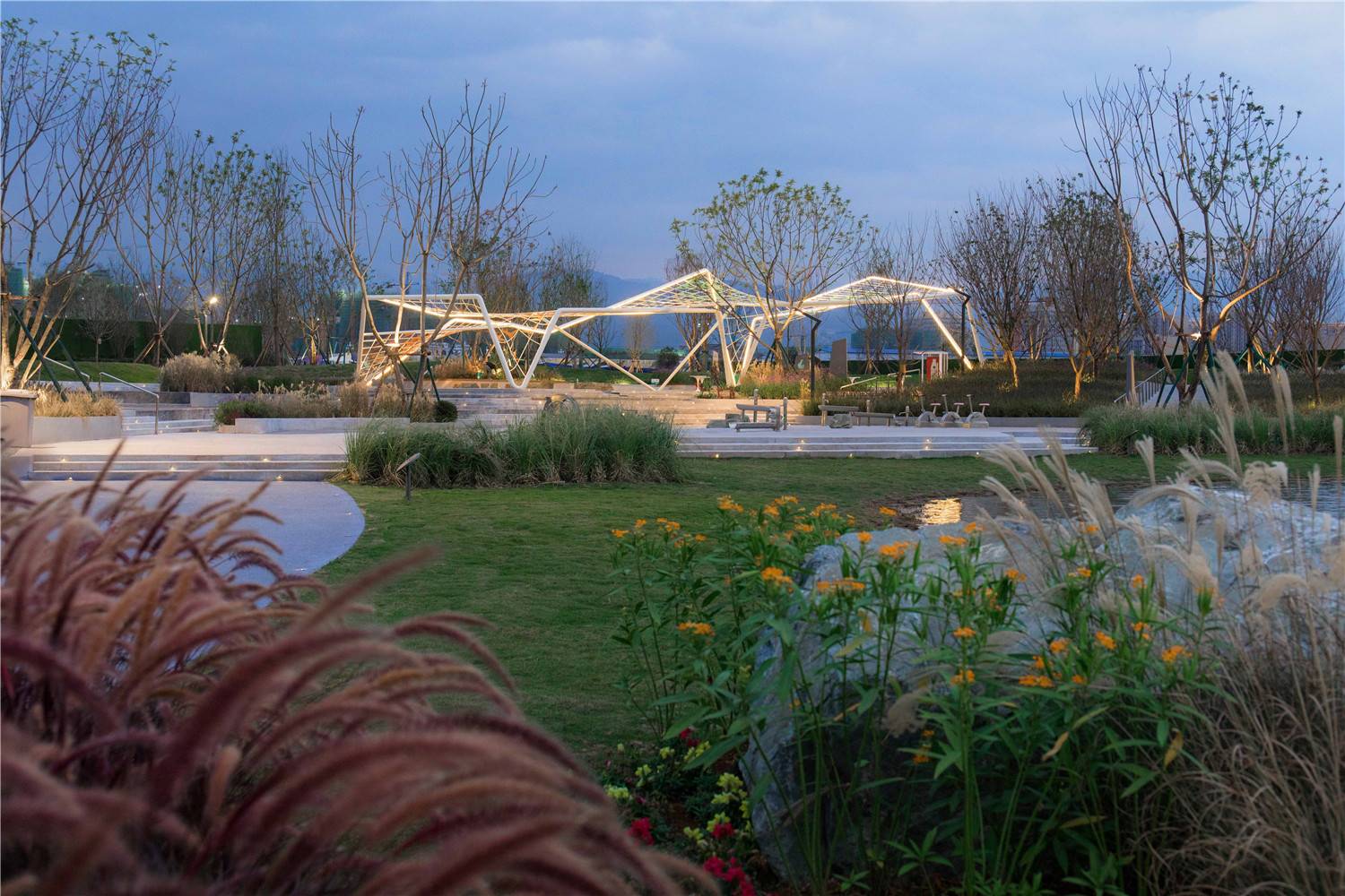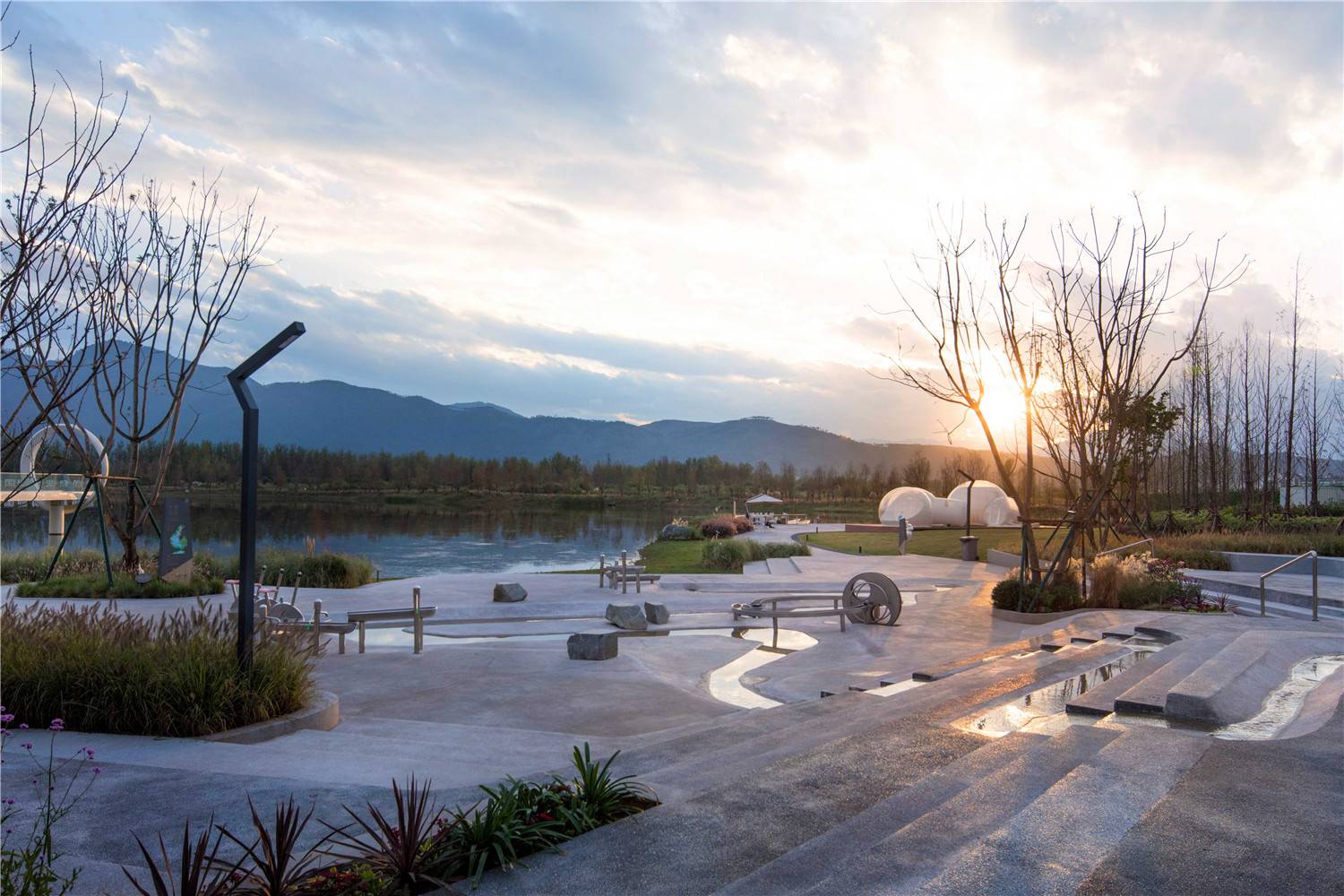It was a beautiful time when my first time met Xingyue Lake. The sky and the lake were the same colour-green, and a vast wave of light was shining among the green mountains and fields. It's just like coming to the ends of the earth, the lake and the mountains are both the yearning of the heart. The inspiration of Haijiao square comes from this first meeting. We want to keep this original intention, so that people who come to the park can see this scene at a glance. Imagine: what do you want it to look like when you live in this community in the future? We try our best to simulate the scene that people will come here in the future. We hope that through the landmark guidance and comfortable and design sense of sunken square, people will be led to the edge of the lake, so that everyone can gather and have a rest here.