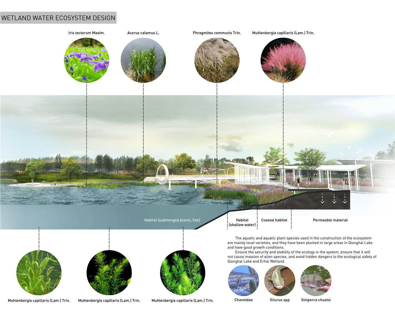 Based on the analysis of the current situation of the site and the particularity of the project location, the landscape style and tree species selection should be consistent with the style of Qionghai scenic area. Secondly, the pollution input should be reduced to achieve zero pollution discharge, making it the first wetland protection barrier between the urban area and the scenic area, and providing high-quality water for Qionghai Lake. We conduct strategic dredging and topographic treatment of the lake water to create a variety of micro environment and promote the diversity of wetland ecosystem. According to the requirements of sponge City, rainwater should be recycled, and the revetment types in key areas should be guided to ensure rich and diverse plant communities in different types of wetlands and spring pools.