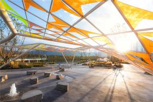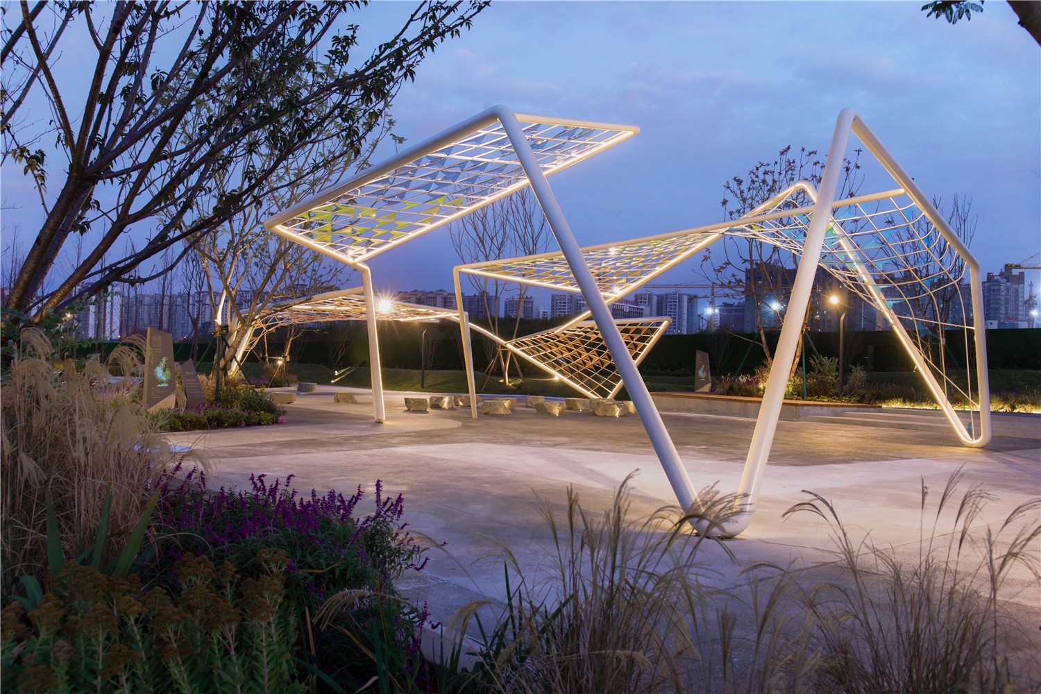 “陽光充足,勝過一切過去的詩”這樣的美好景象,是設(shè)計(jì)師想帶給大家的?!芭c光有關(guān)”的海鷗歸來廊架,抽取海鷗為設(shè)計(jì)元素形成具有張力的景觀構(gòu)架,同時(shí)兼具風(fēng)動和光影的景觀效果,使場地更具標(biāo)識性、互動性。