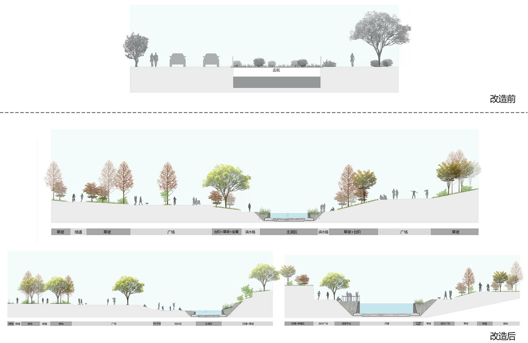 The surrounding land of the downstream section is mostly residential communities and schools. The main renovation measures for this section are to remove the cover plate, dismantle the original revetment of masonry, widen the river channel and transform it into a variety of ecological duplex sections. Combined with the design of multi-layer steps, water playing squares and stages, make it being a dynamic area where citizens can participate and interact.