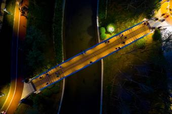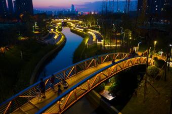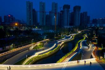 ▲夜幕下的河流成為市民傍晚休閑健身的好去處,the riverside becoming the destination for local people to work out in the dusk ?中國電建集團(tuán)西北勘測設(shè)計(jì)研究院有限公司