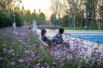 種植方面,我們通過大比例的常綠喬木及落葉喬木栽植形成森林骨架,喬木覆蓋率高達(dá)70%,塑造城市森林的景觀氛圍。其中,大量運(yùn)用美國紅楓、美國紅櫟、叢生蒙古櫟、元寶楓等秋色葉樹種,構(gòu)建色葉混交林、突出秋季景觀特色。靠近人活動(dòng)的區(qū)域,栽植北美海棠、碧桃、柳葉馬鞭草等開花植物,豐富色彩變化。