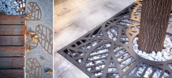 ▲“樹葉”母題在鋪裝、樹篦子、特色燈具、桌面、廊架等不同載體中的展現(xiàn),display of the image of “l(fā)eaves” in different carriers, such as pavement, tree grate, lamps, tabletop and pergola ? 大丹工作室