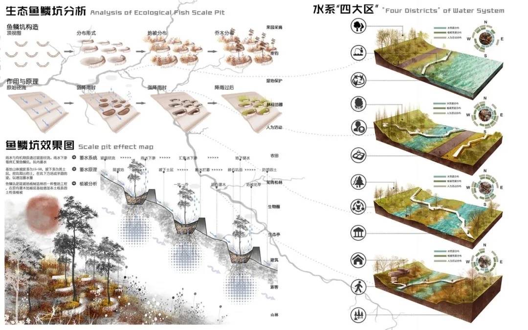 山村以及旅游規(guī)劃區(qū)域生態(tài)治理是一個(gè)循序漸進(jìn)的過程,處理人與自然關(guān)系,生活設(shè)施與環(huán)境關(guān)系,可持續(xù)發(fā)展等等為核心解決各種規(guī)劃問題。山地現(xiàn)有道路為山林護(hù)林消防道,多處有水土流失,山體滑坡問題,結(jié)合生態(tài)提出解決方案:生態(tài)魚鱗坑。
