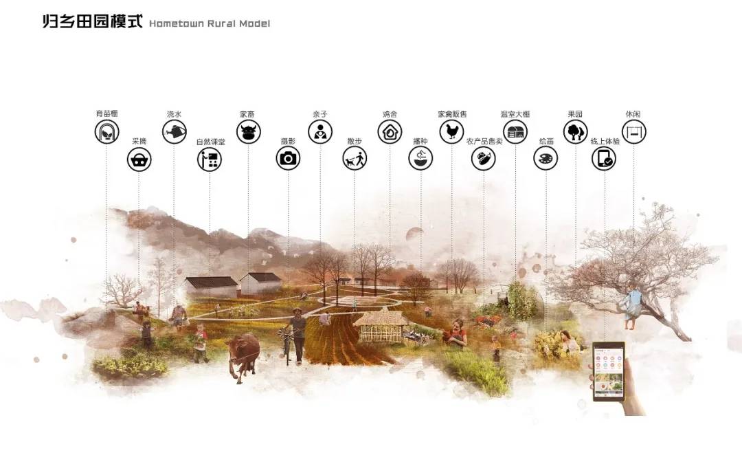 歸鄉(xiāng)田園模式結(jié)構(gòu):模式為線上線下兩部分,線下實(shí)地分為村民、游客兩大部分,村民提供生產(chǎn)與服務(wù),游客群體范圍包括:老知青、團(tuán)建、親朋、學(xué)生、藝術(shù)家等等,能夠提供:文化學(xué)習(xí)、農(nóng)家樂、鄉(xiāng)村旅游、休閑住宿娛樂一體、寫生采風(fēng)、文學(xué)藝術(shù)創(chuàng)作、等等。線上以app與公眾號(hào)形式,由村民與投資者運(yùn)營管理后臺(tái)市場(chǎng)開發(fā)與宣傳,使用者可通過網(wǎng)絡(luò)預(yù)訂各項(xiàng)需求(有機(jī)農(nóng)場(chǎng)、吃喝住宿、公益林,產(chǎn)品售賣)。五谷農(nóng)田模式結(jié)構(gòu):基于當(dāng)代人們對(duì)五谷概念的淡忘,出現(xiàn)五谷不分現(xiàn)象,同時(shí)依托鄉(xiāng)村旅游這一結(jié)締,開發(fā)出一條以五谷為主體的鄉(xiāng)村農(nóng)田體驗(yàn)?zāi)J剑簩⑥r(nóng)產(chǎn)品種植、管理、收獲、加工、售賣與體驗(yàn)相結(jié)合,延伸出第二產(chǎn)業(yè),由第一產(chǎn)業(yè)聯(lián)動(dòng)第二產(chǎn)業(yè)進(jìn)行。項(xiàng)目有:農(nóng)田片化承包,農(nóng)作民俗表演與體驗(yàn)、五谷藝術(shù)節(jié)、秸稈創(chuàng)作、農(nóng)作物加工作坊觀光與體驗(yàn)等。