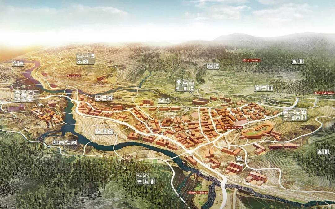 以村落為核心,通過點(diǎn)線網(wǎng)的形式鏈接每一個(gè)旅游節(jié)點(diǎn),在保證不破壞山體自然環(huán)境的基礎(chǔ)上構(gòu)建旅游設(shè)施。