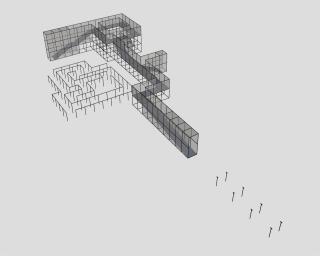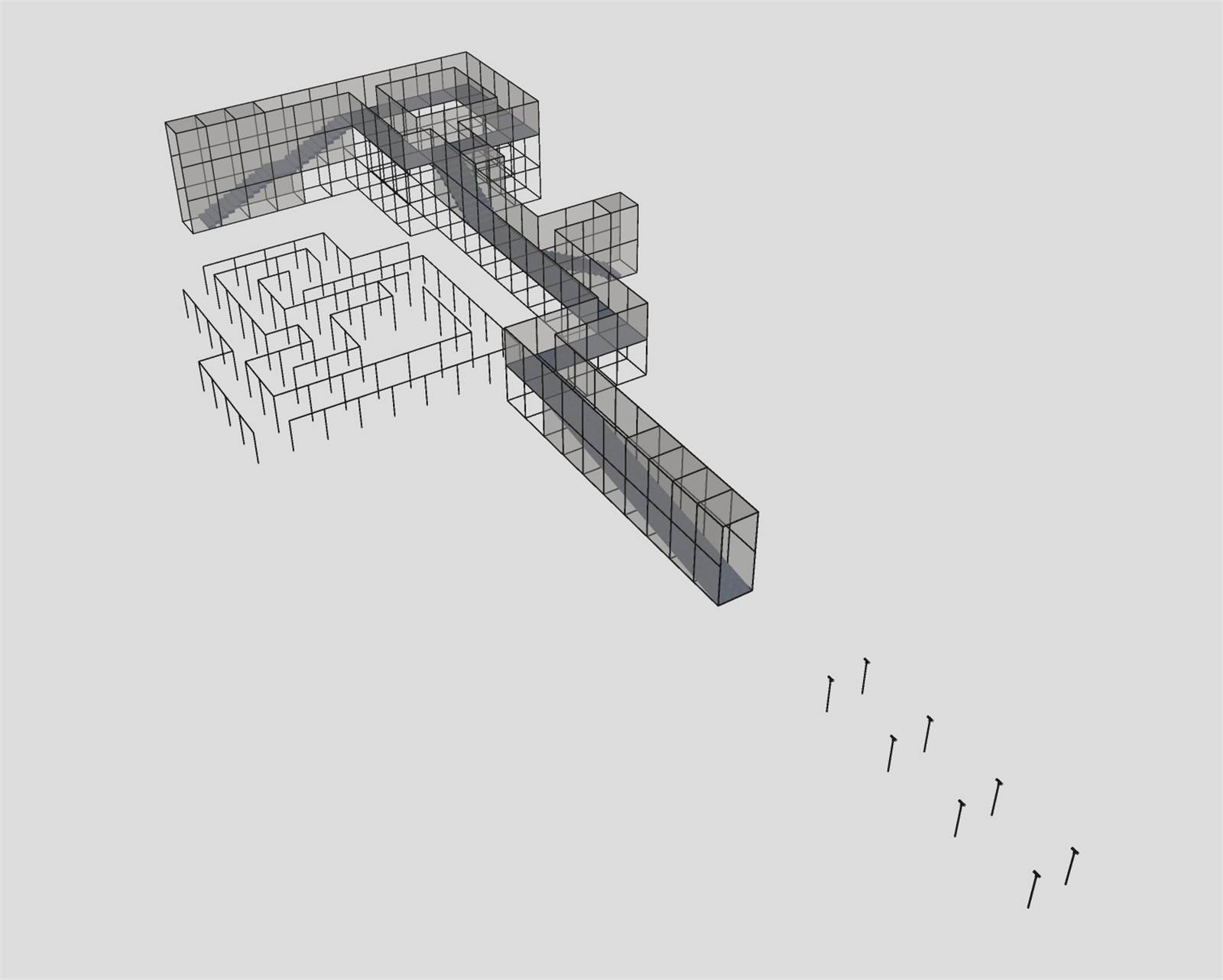 UAO團(tuán)隊(duì)在最開(kāi)始,將現(xiàn)狀的所有桿件進(jìn)行了統(tǒng)計(jì)和分類,將可利用的原有桿件組合成一個(gè)新的方案:這個(gè)方案含有幾大單元:一是利用較長(zhǎng)的桿件,圍繞場(chǎng)地內(nèi)需要保留的幾棵樹(shù),形成滿足兒童游走的一個(gè)多層的廊道系統(tǒng);另外就是利用較短的桿件,主要是1.25米的橫向桿件,組合成一個(gè)迷宮。它充分考慮兒童的行為習(xí)慣:追逐、不知疲倦的奔跑、躲貓貓等探知行為模式。