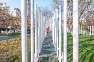 UAO創(chuàng)始人李濤在看過(guò)現(xiàn)場(chǎng)故事感十足的兒童游樂(lè)攀爬設(shè)施后,覺(jué)得保留利用現(xiàn)場(chǎng)的兒童游樂(lè)設(shè)施的桿件,改造成新的一個(gè)游樂(lè)園區(qū),應(yīng)該作為設(shè)計(jì)的創(chuàng)意出發(fā)點(diǎn),它包含兩層意思:一是雖然還是櫻花樹(shù)的主題園區(qū),但卻包含了滿足兒童游戲的一個(gè)原有場(chǎng)地的功能。它對(duì)原來(lái)的場(chǎng)地功能是一種更新式的延續(xù);二是櫻花作為非常時(shí)令的一種觀賞景觀,它的美在于轉(zhuǎn)瞬即逝的一種“瞬時(shí)”的美,但作為一個(gè)公園,也要滿足365天除了約兩周15天賞櫻之外的使用頻率問(wèn)題,而將兒童游樂(lè)功能繼續(xù)保留,就滿足了350天的時(shí)間的使用可能。