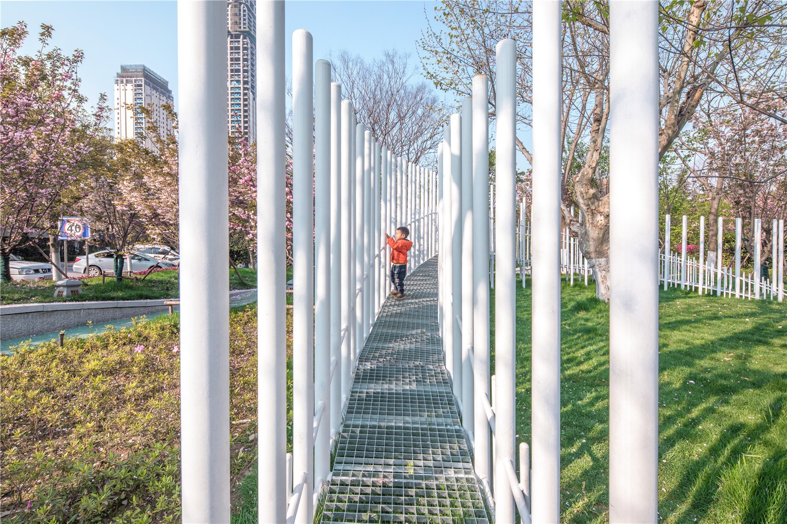 最后實(shí)施的方案中,桿件被組合成了一系列小品:坡道、秋千、亭子等,這些桿件小品本身就成為兒童游樂(lè)設(shè)施的一部分,同時(shí)又將場(chǎng)地縫合在了一起;同時(shí)它提供了駐足和觀賞的場(chǎng)所和觀景的框景,為小游園提供了趣味性,鼓勵(lì)兒童去探知和發(fā)現(xiàn)。