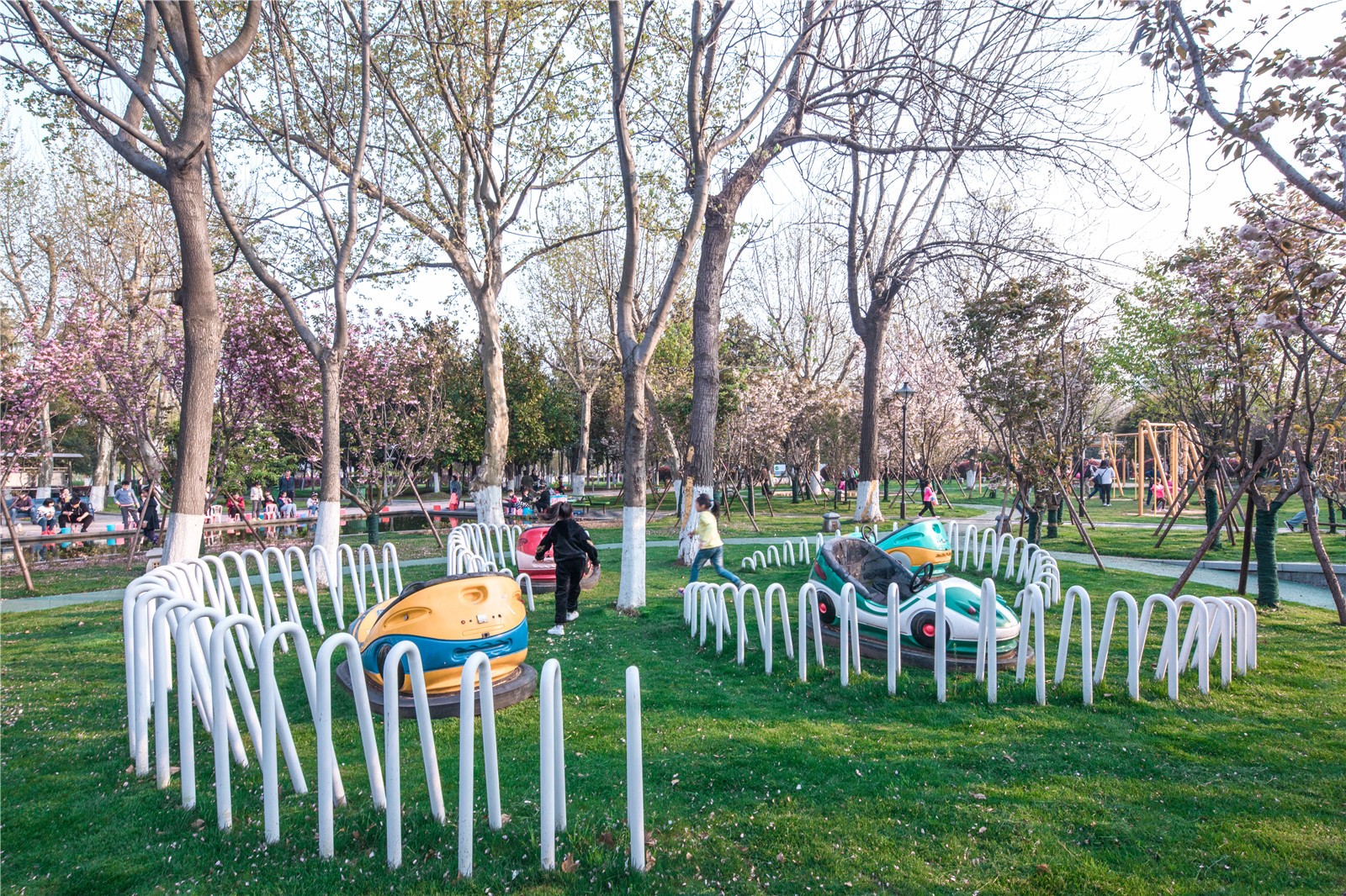 Original trees in the field are preserved, and the new varieties of cherry blossom include:Yunnan early Sakura, Japan early Sakura, Yoshiyoshi Yoshino, mountain cherry, etc. The circular trail around the site also becomes a walkway for the tourists to jog, while the topography is raised to form a resting seat. The bumper cars left in the original site were kept in the stadium.