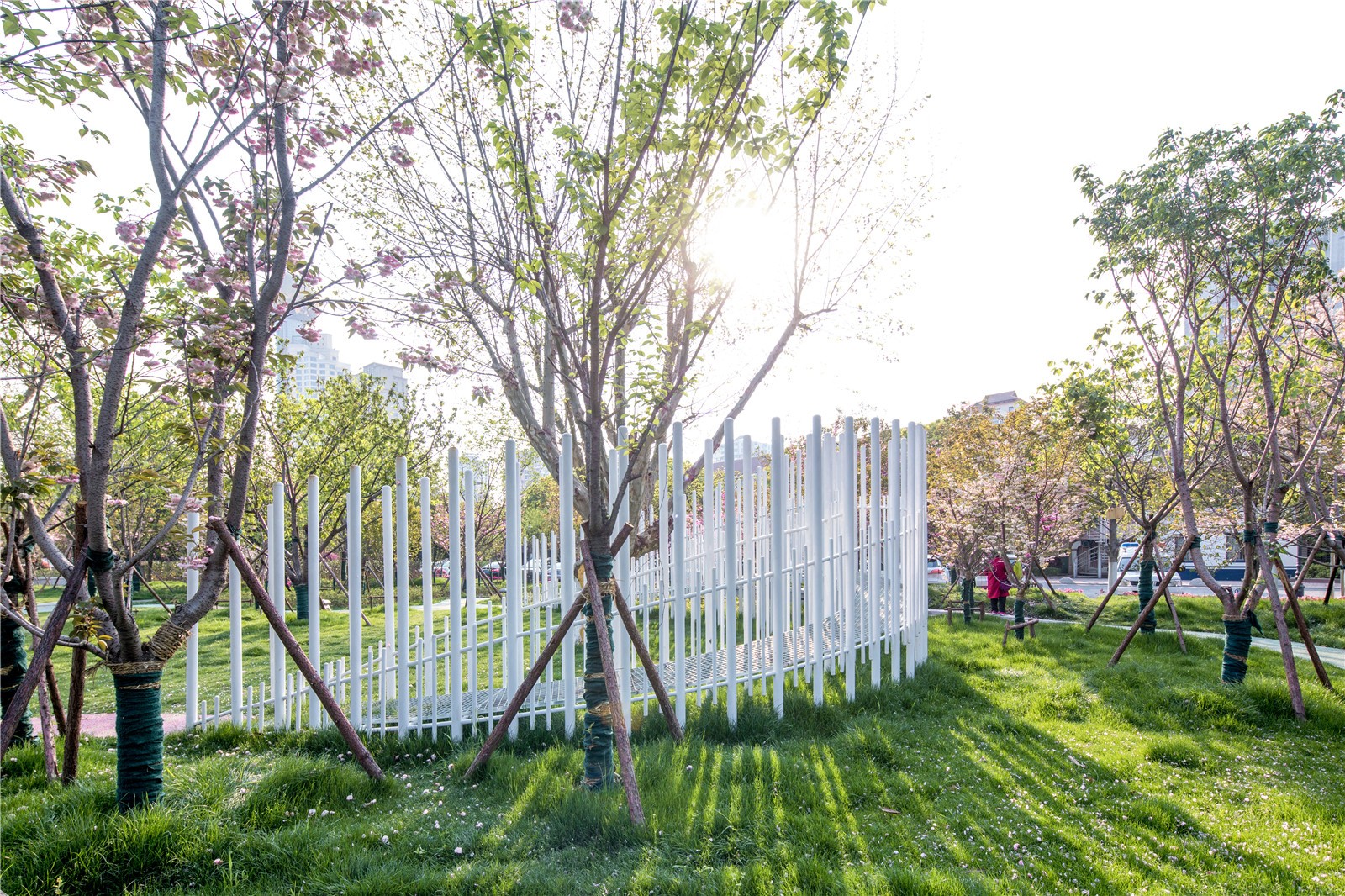 UAO wants to express an idea through such a project, that is: the boundaries between architectural design and landscape design should be vague and uncertain, which may be subordinate to landscape architecture category (or plant architecture). Temporary and growth landscape(the instant cherry blossom period) as well as solid construction with space construction ability ( constant exist of rod pieces) form a contrast naturally.The boundaries between the landscape and architecture can be blurred, all the elements of landscape (plants, slope, etc.)can be used as a "material" for creating a sense of space,just like walls, columns, and rods in architecture.We try to solve the landscape problems with space design method usually used in architecture and extend the boundaries of traditional garden design techniques in order to achieve the representation of modernist landscape features.