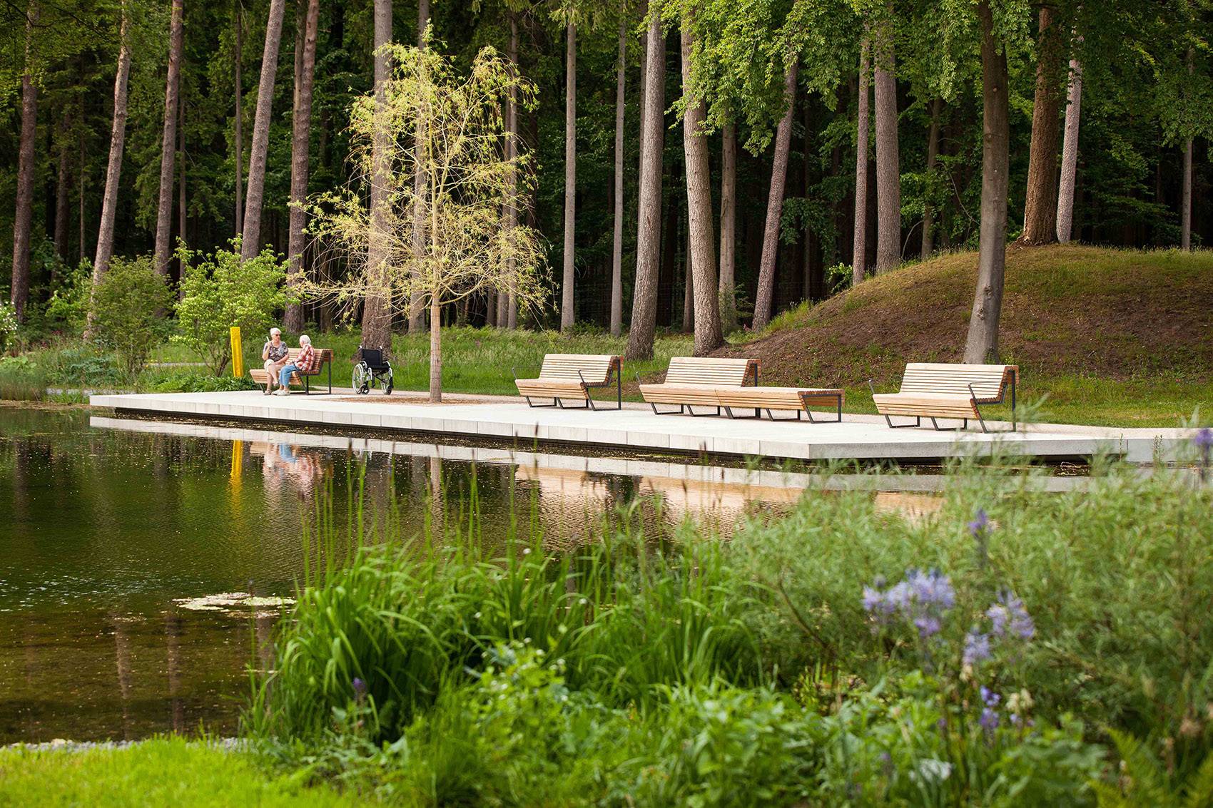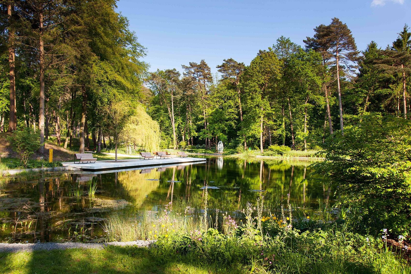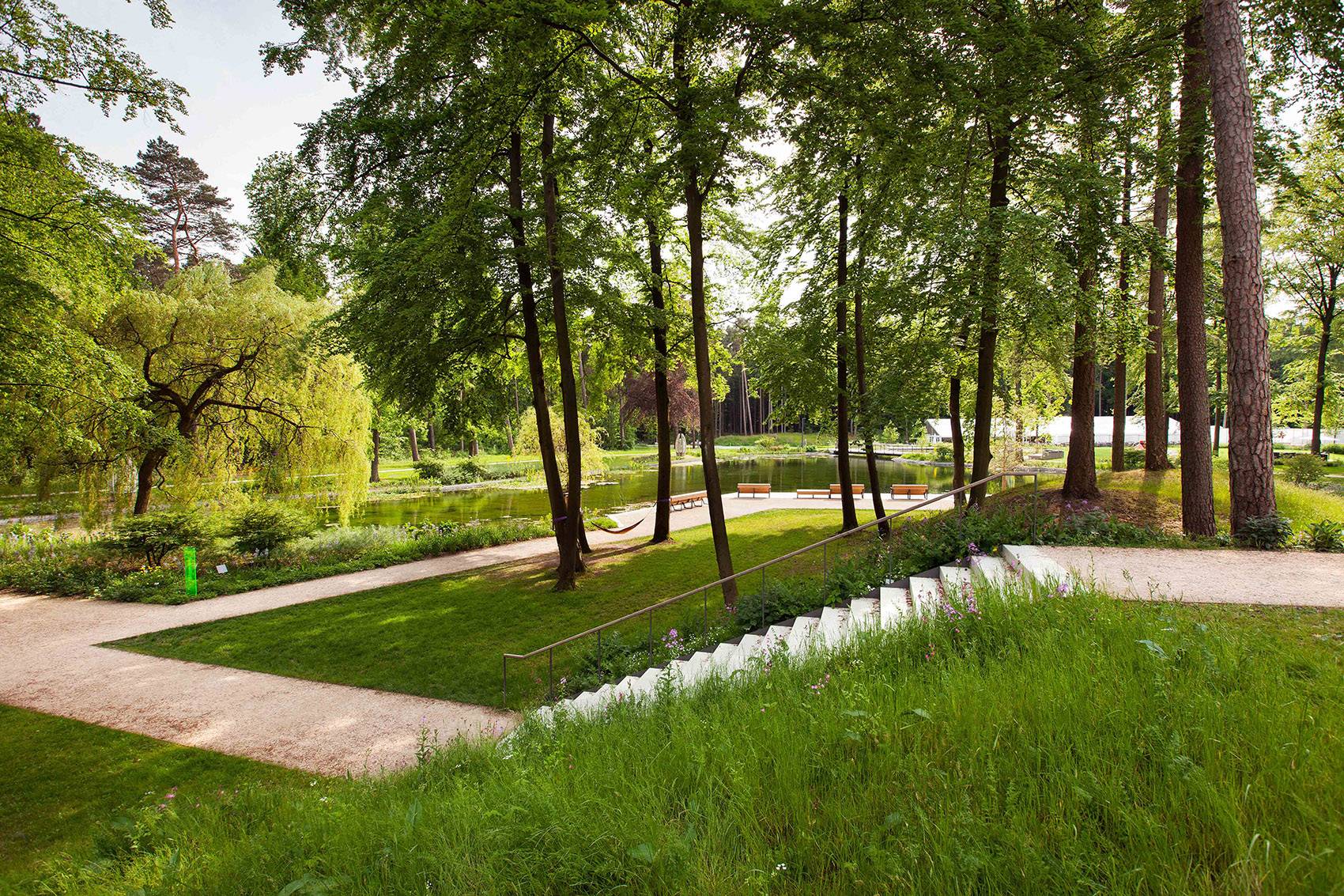 The ?Meersmannteiche“ between the dunescapes were not visible at the time of the design process. Now they are reintegrated as a central part of the landscape ensemble. The existing trees were thinned to provide softly contoured views and open lawns for picknicking, playing and recreation.Through this, the relief of the landscape becomes perceptible once again and sun can reach perennials and bodies of water while single trees enrichen the parkscape. The restored ponds are accesible via pedestals. On the peak of a large dune, seating is provided enabling a wide view.