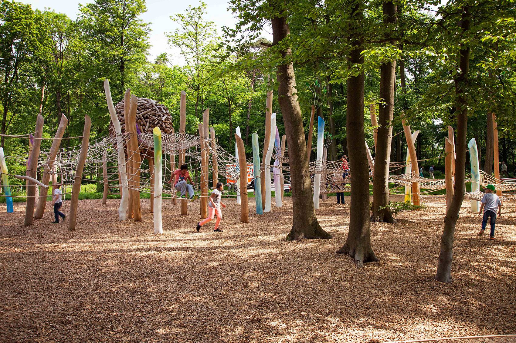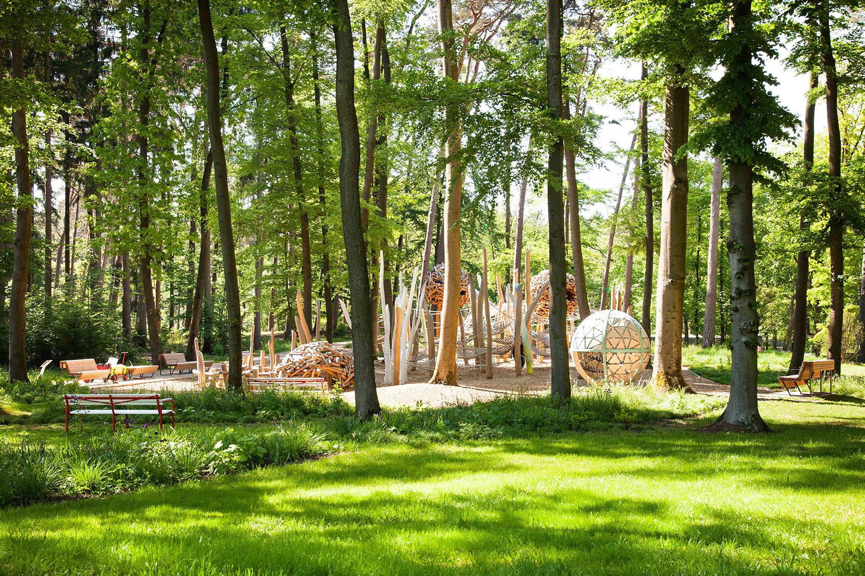 All playground elements are unique designs – developed directly on site, they are truly connected to their surrounding. Signs hinting at the existence of fantastical beings dwelling in the forest can be found throughout the park – hints of fairies and elves, trolls and ogres.