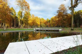 The basic structure of the park is based upon the historical layout of the orthogonally oriented forest blocks. Aligning with the historical layout, existing paths in and around the park were improved upon and new paths were added. Clear spatial images of different intensitites are woven into the dense existing forest. However recurring materials throughout the different areas of the park reunite the perception of the park as a whole. They introduce light, air and space into the forest, without compromising the forest’s aura of mystique and magic.