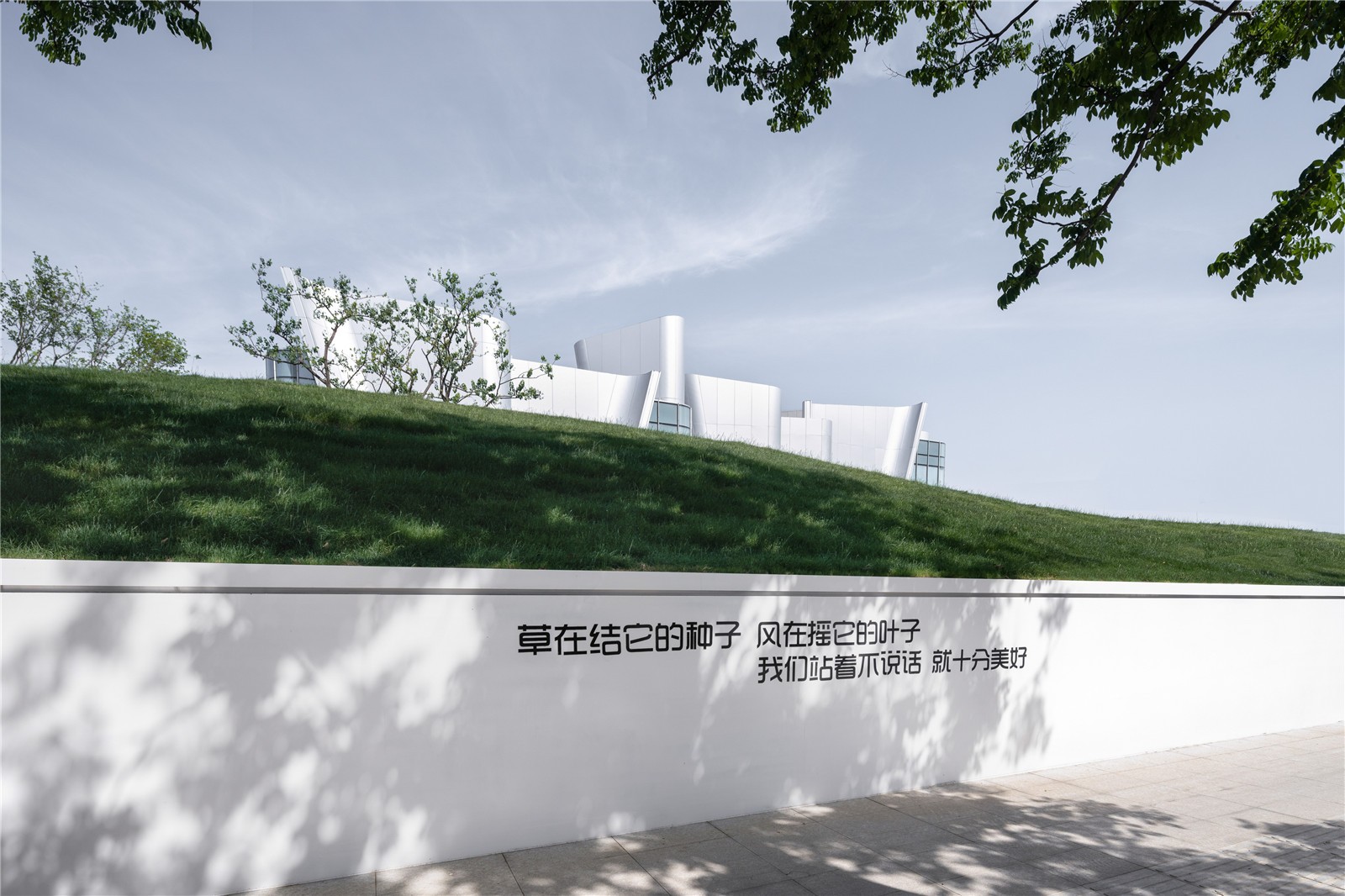 白墻、水池、草坪,用這些最簡單的元素拼接結(jié)合無限延伸出空間意趣,將樹影花語、風(fēng)雨晴雪、都市霓虹,以不同的表現(xiàn)方式,投影到建筑和景墻之上,猶如24小時不落幕的時光電影。