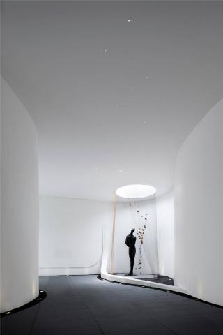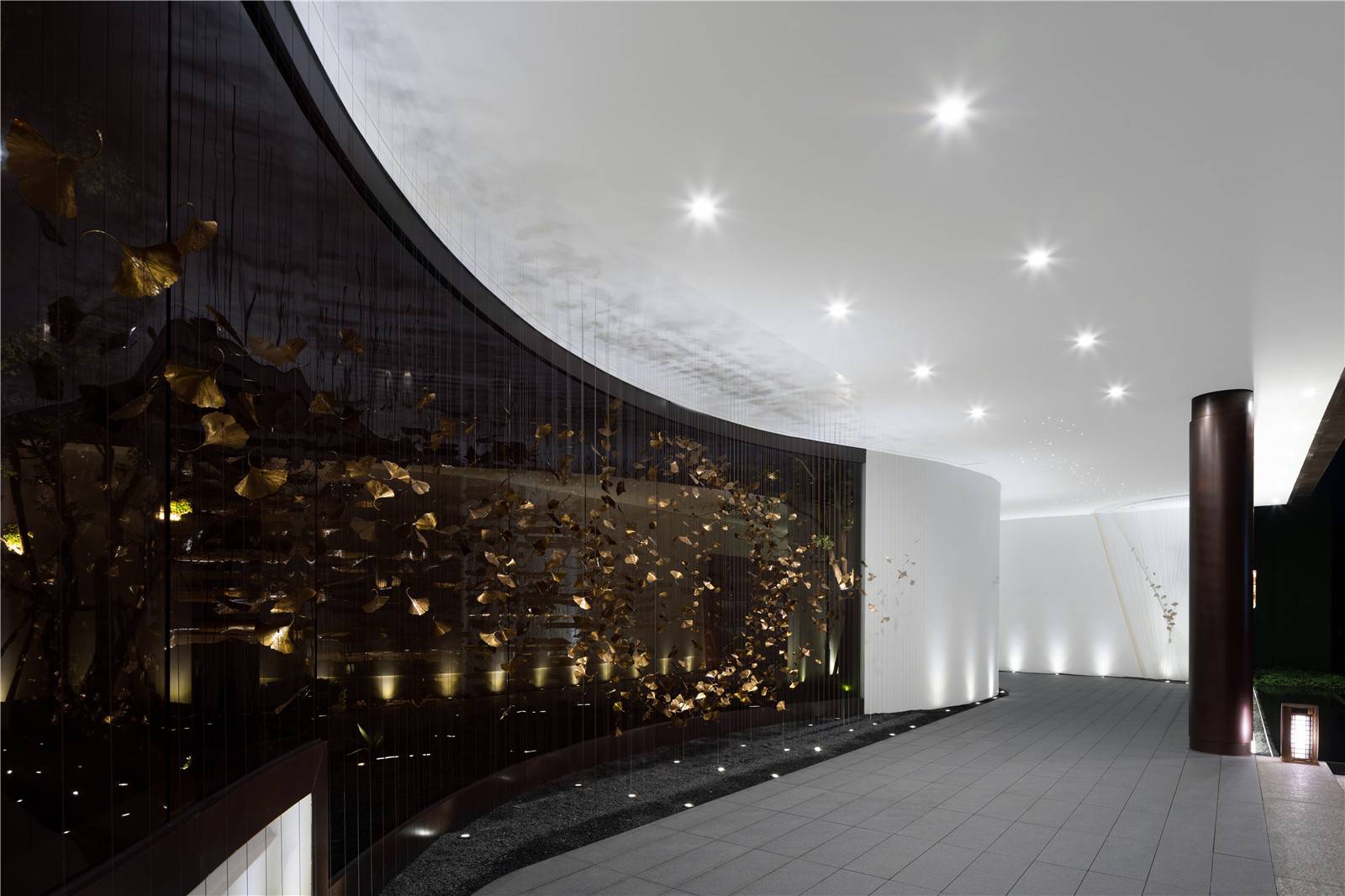 從建筑中抽取檐的形式演化成形象入口具有層次的頂部空間,從銀杏葉中提取形、色演化成印花、裝置與點綴色。