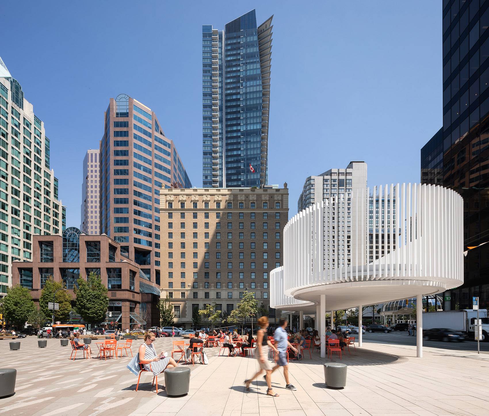 ▲改造后的廣場(chǎng)成為氣氛熱鬧的新城市中心,the square has been transformed into a new bustling epicentre in downtown Vancouver ?Hapa Collaborative