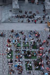 Bright red café style tables and chairs contrast the grey, and allow for long lunches, resting, or reading in the sunshine. ?x????n?q Xwtl’e7én? Square acts as an anchor for Robson Square – the iconic mid-century design by Arthur Erickson and Cornelia Oberlander – which hugs the gallery on the opposite side. Robson Square’s signature concrete slab pavers extend into the plaza, acting as a border to the space. A double row of maples along Hornby street creates a lovely pedestrian allée. In tandem, the spaces comprise the living room of the city: a generous plaza ripe with year-round activity, abuzz with social energy in the heart of successfully transformed downtown.