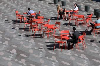 ▲咖啡館風(fēng)格的紅色桌椅與灰色的地面形成鮮明對(duì)比 bright red café style tables and chairs contrast the grey ?Hapa Collaborative