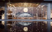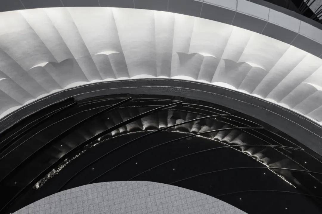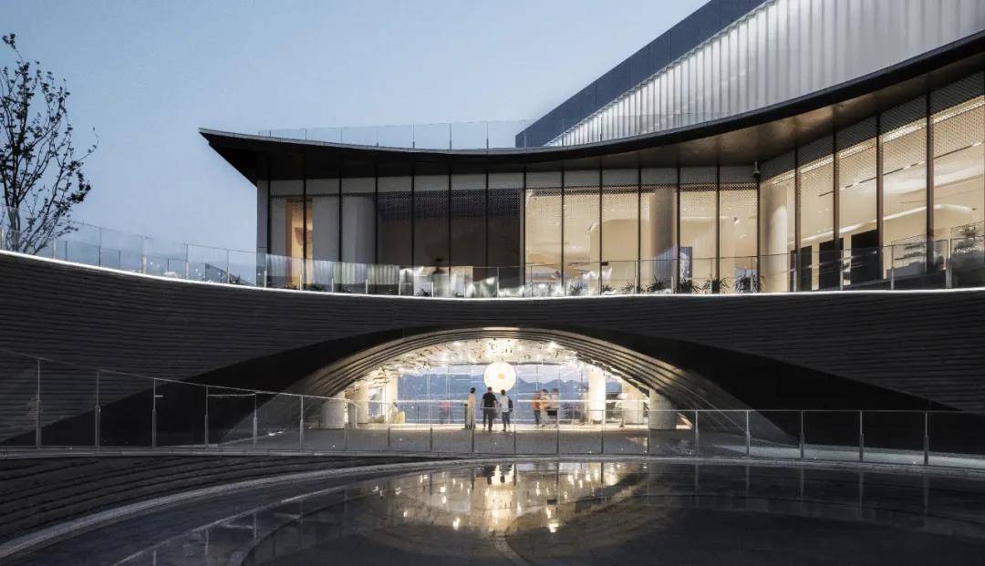 在有限的場地中如何將空間體驗放大,設計將建筑景觀室內(nèi)的邊界進行弱化,建筑的幕墻和景觀圍合有機融合,通過拱的語言將室外中心坡道與室內(nèi)書吧串聯(lián),打造“星空之眼”,同時將觀者視線繼續(xù)向外延伸,再次與外部的天地、山水、自然進行連結(jié),統(tǒng)一打造一體化的空間情緒遞進。
